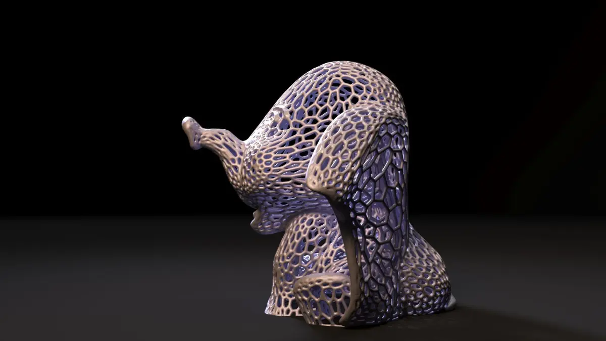The surface of the elephant is decorated with the characteristic Voronoi cells,which create a light and airy appearance and allow light to refract anddiffuse in different ways.