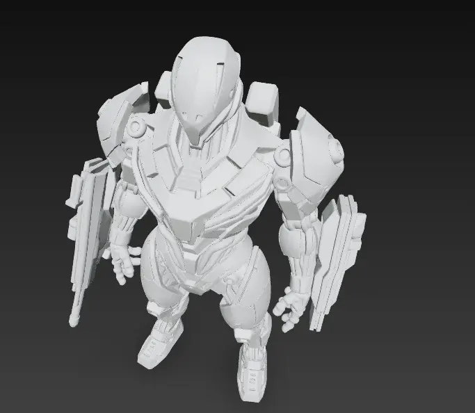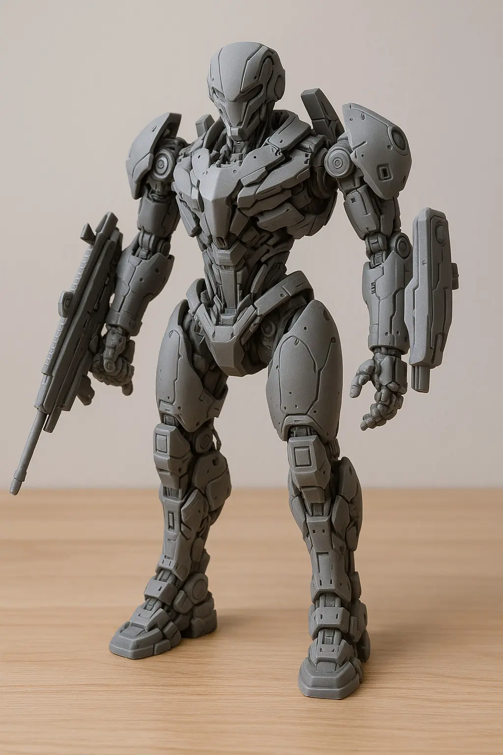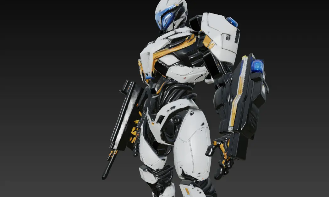 This image features a futuristic combat android, clad in a sleek white and black exosuit with golden accents and glowing blue elements. With an athletic humanoid structure, the android stands in a powerful pose holding a high-tech rifle, exuding strength, precision, and technological superiority. Its design suggests it's a high-ranking elite unit, possibly used in advanced military operations or sci-fi narratives.