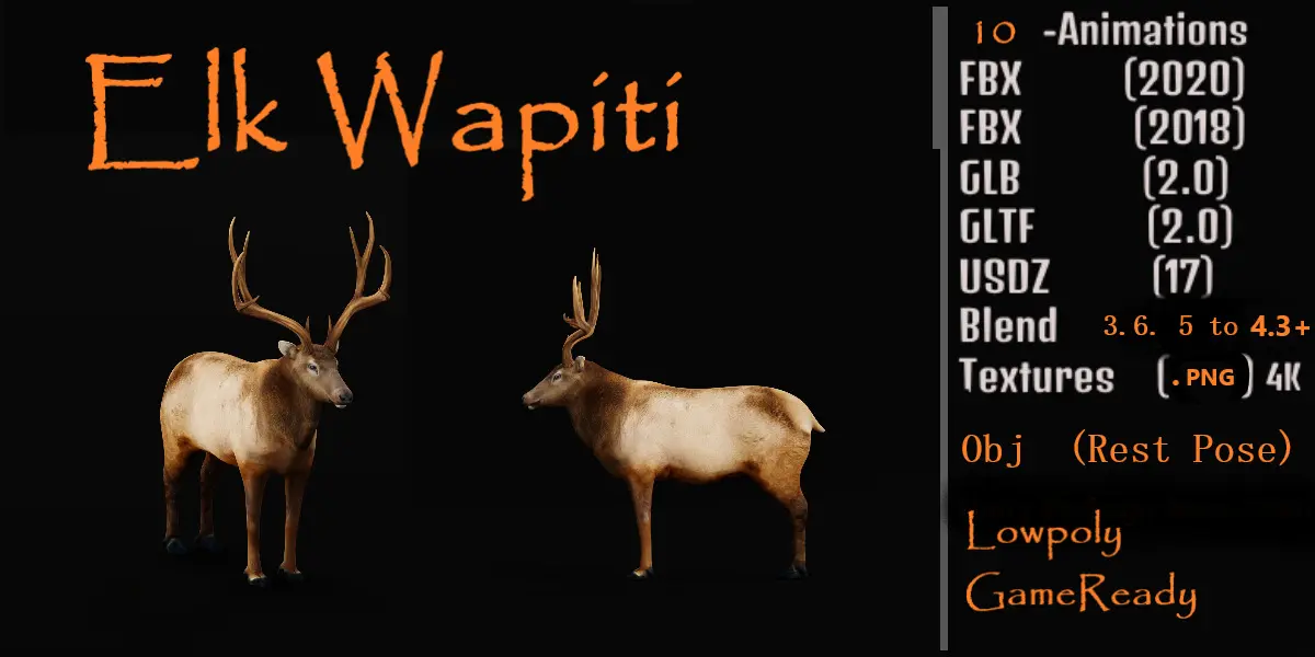 Diffuse,Metallic,Roughness,Normal Map,Specular,AOThe elk or wapiti, is the second largest species within the deer family, Cervidae, and one of the largest terrestrial mammals in its native range of North America and Central and East Asia..3D Elk Wapiti Animal Model By Nyilonelycompany.