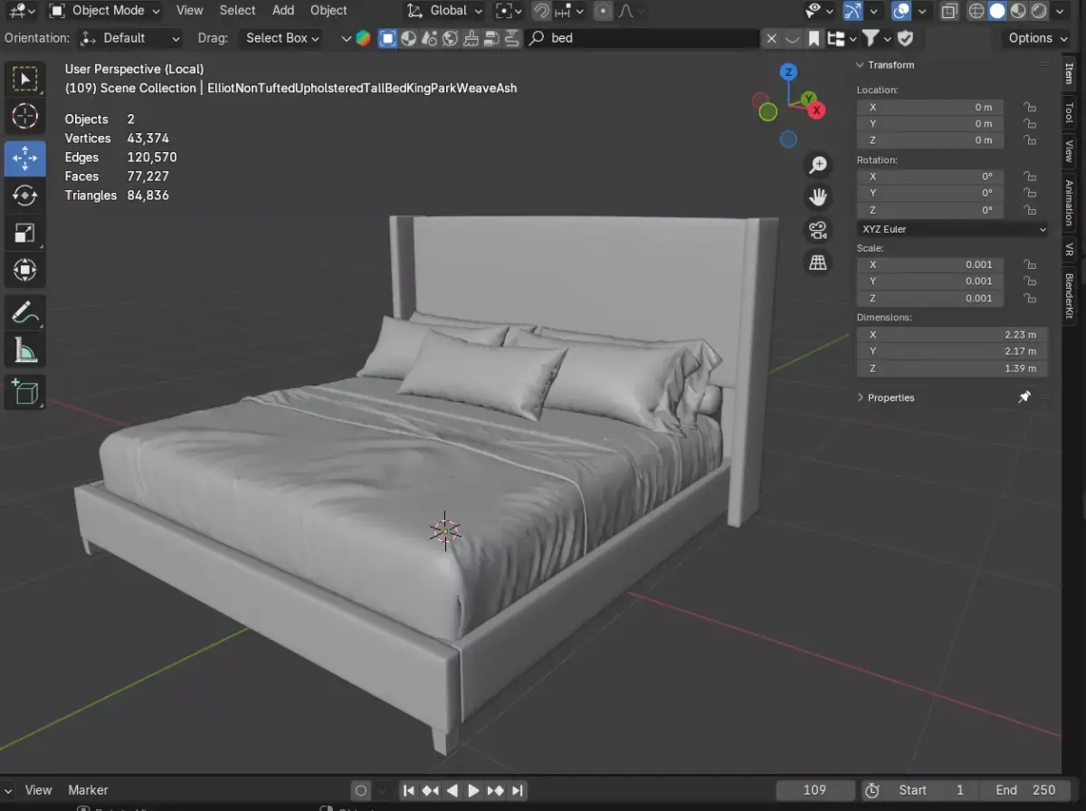 The model includes a detailed headboard, mattress, and frame with realistic PBR textures, making it ideal for interior renders, architectural visualization, furniture catalogs, and real-estate staging. Materials are optimized for both Cycles and Eevee, ensuring high-quality output and efficient performance.