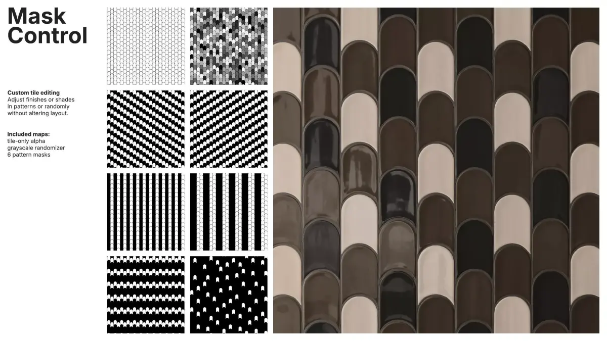 Pattern and random masks allow independent control of tile and grout colors, enabling global, per-pattern or per-tile adjustments without disturbing the layout. Tile-only alpha, a grayscale randomizer and pattern masks ensure full customization for complex designs.