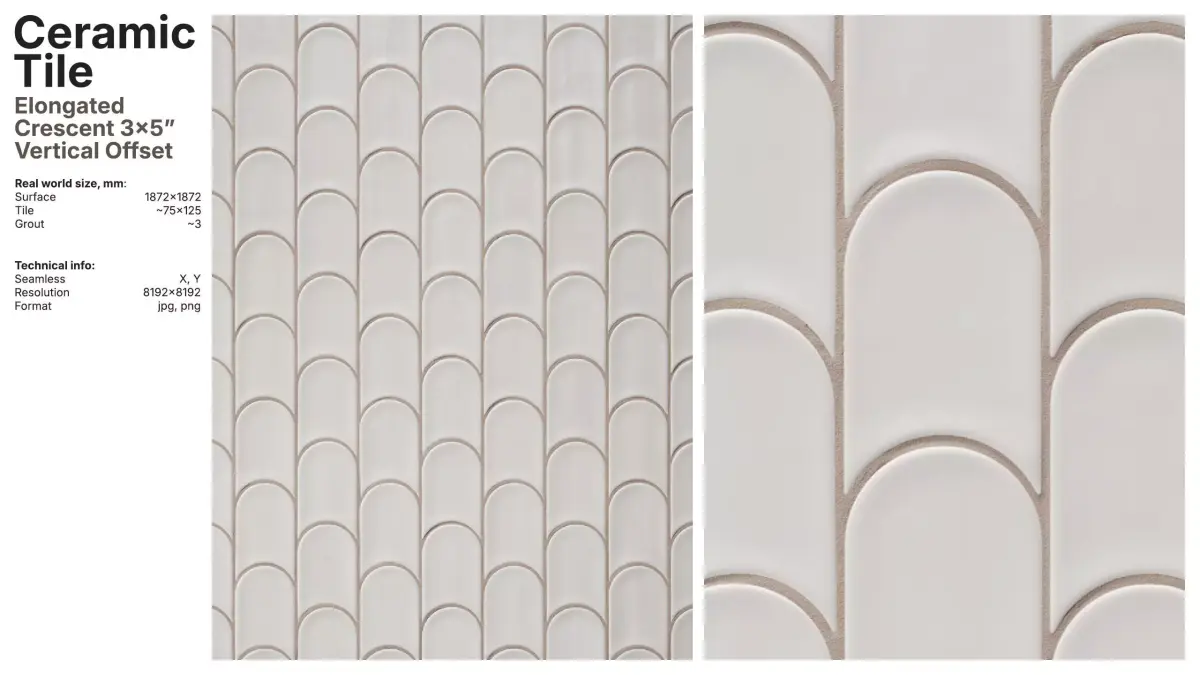 Glazed artisan ceramic tile material in a elongated crescent 3x5" format arranged in a vertical offset layout.