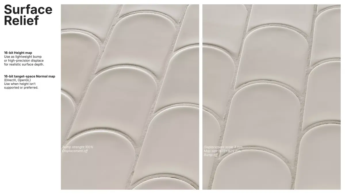 Surface relief is provided by a RAW 16-bit height map tuned for a true 3 mm depth (1872x1872 mm surface), suitable for lightweight bump or precise displacement. A 16-bit tangent-space normal map (DirectX/OpenGL) is included for cases where height-based workflows aren’t preferred.