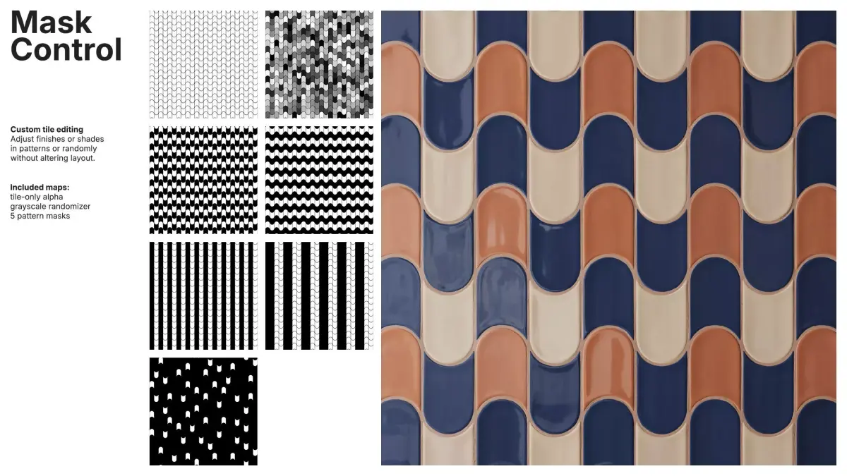 Pattern and random masks allow independent control of tile and grout colors, enabling global, per-pattern or per-tile adjustments without disturbing the layout. Tile-only alpha, a grayscale randomizer and pattern masks ensure full customization for complex designs.