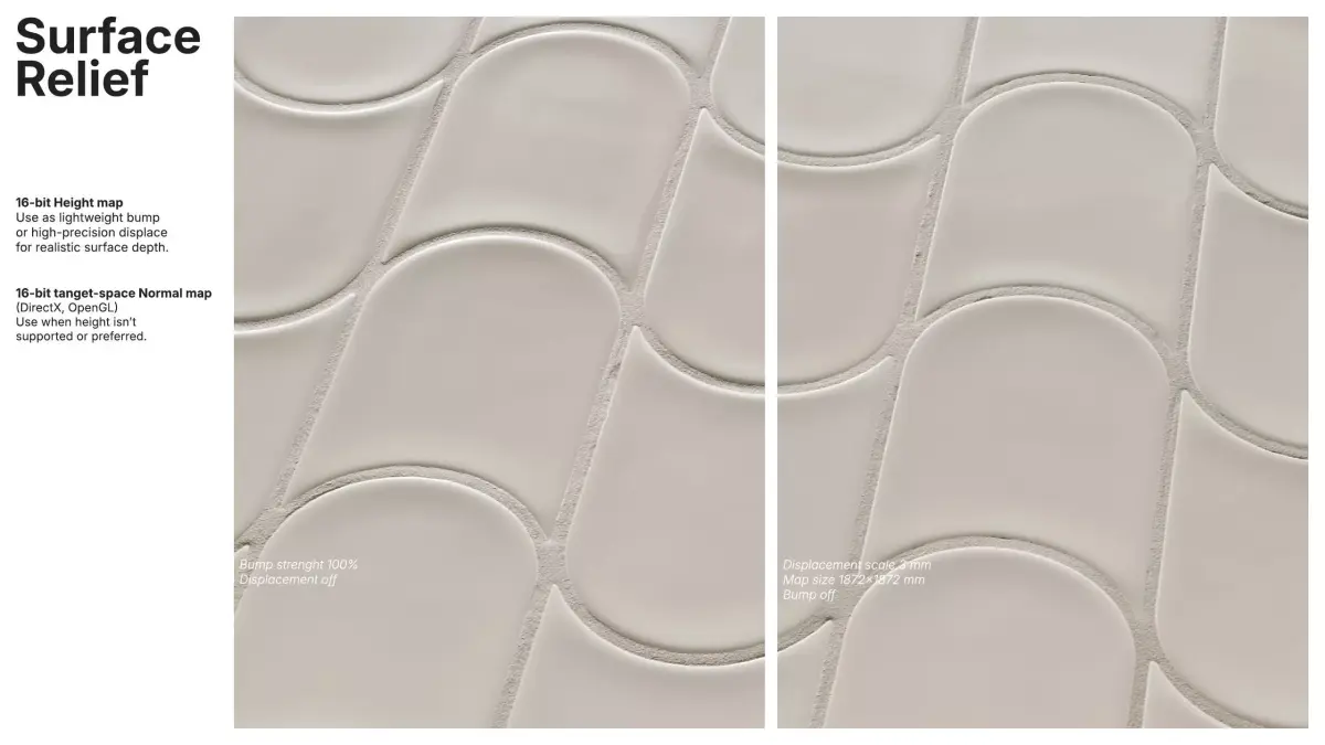 Surface relief is provided by a RAW 16-bit height map tuned for a true 3 mm depth (1872x1872 mm surface), suitable for lightweight bump or precise displacement. A 16-bit tangent-space normal map (DirectX/OpenGL) is included for cases where height-based workflows aren’t preferred.