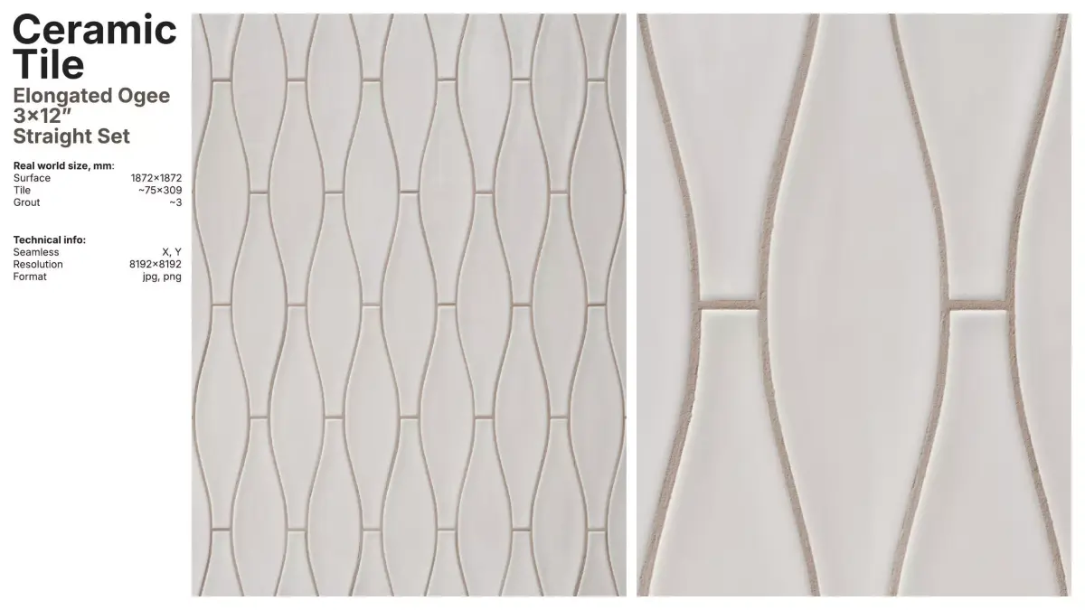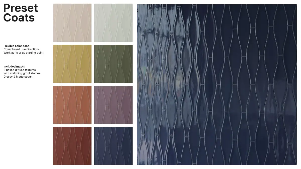 The package includes 8 diffuse variations with matching grout tones, and a flexible color base that works out-of-the-box or as a starting point for custom looks.
