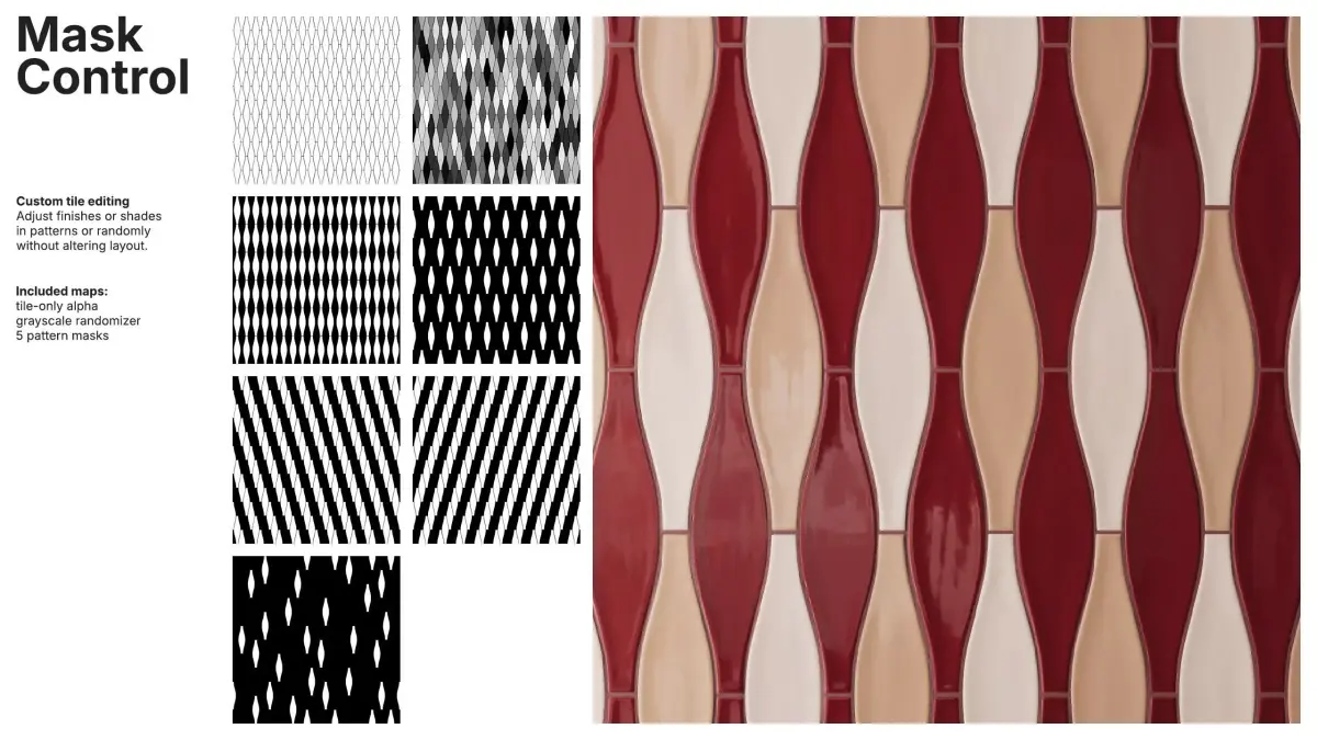 Pattern and random masks allow independent control of tile and grout colors, enabling global, per-pattern or per-tile adjustments without disturbing the layout. Tile-only alpha, a grayscale randomizer and pattern masks ensure full customization for complex designs.