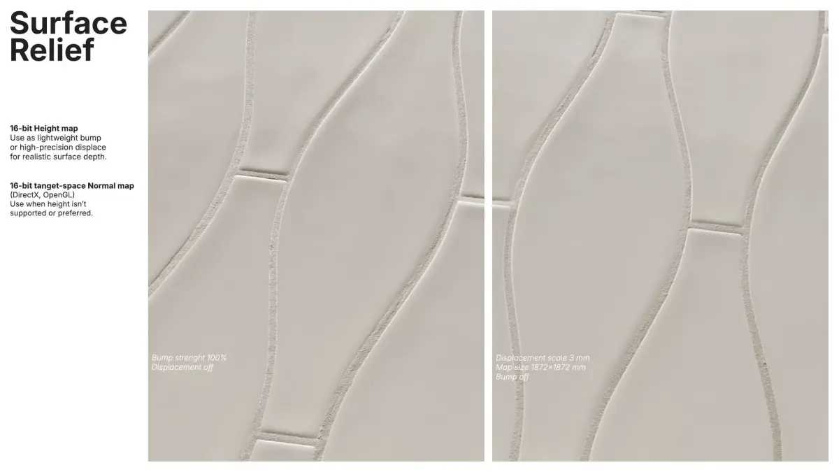 Surface relief is provided by a RAW 16-bit height map tuned for a true 3 mm depth (1872x1872 mm surface), suitable for lightweight bump or precise displacement. A 16-bit tangent-space normal map (DirectX/OpenGL) is included for cases where height-based workflows aren’t preferred.