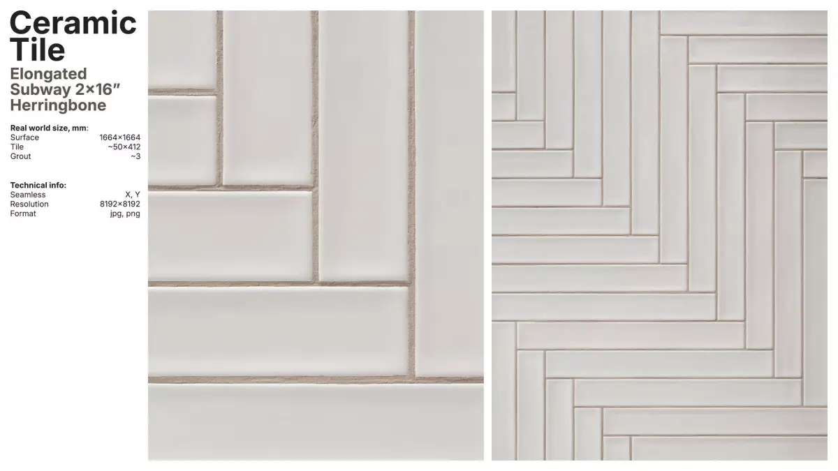 The package includes 8 diffuse variations with matching grout tones, and a flexible color base that works out-of-the-box or as a starting point for custom looks.