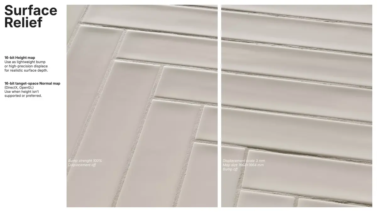 Surface relief is provided by a RAW 16-bit height map tuned for a true 3 mm depth (1664x1664 mm surface), suitable for lightweight bump or precise displacement. A 16-bit tangent-space normal map (DirectX/OpenGL) is included for cases where height-based workflows aren’t preferred.