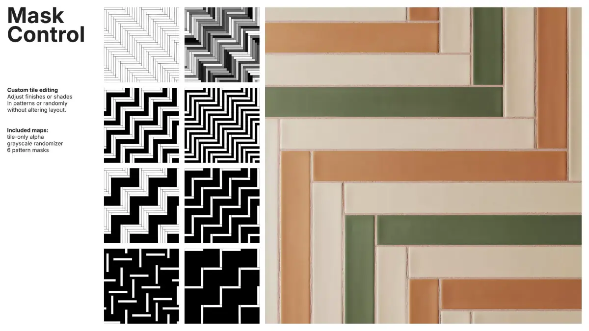 Pattern and random masks allow independent control of tile and grout colors, enabling global, per-pattern or per-tile adjustments without disturbing the layout. Tile-only alpha, a grayscale randomizer and pattern masks ensure full customization for complex designs.