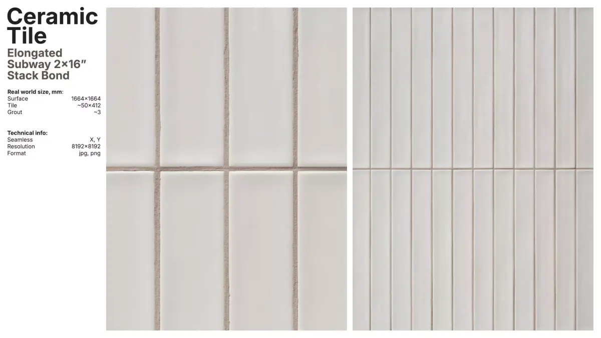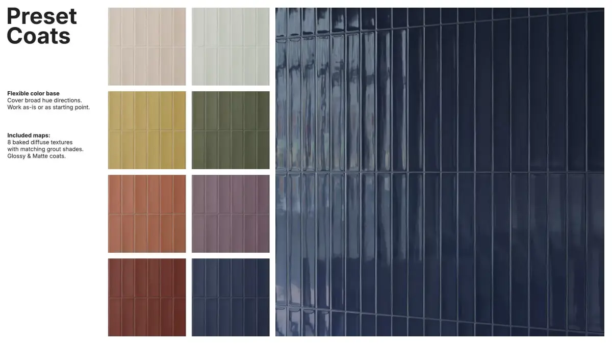 The package includes 8 diffuse variations with matching grout tones, and a flexible color base that works out-of-the-box or as a starting point for custom looks.
