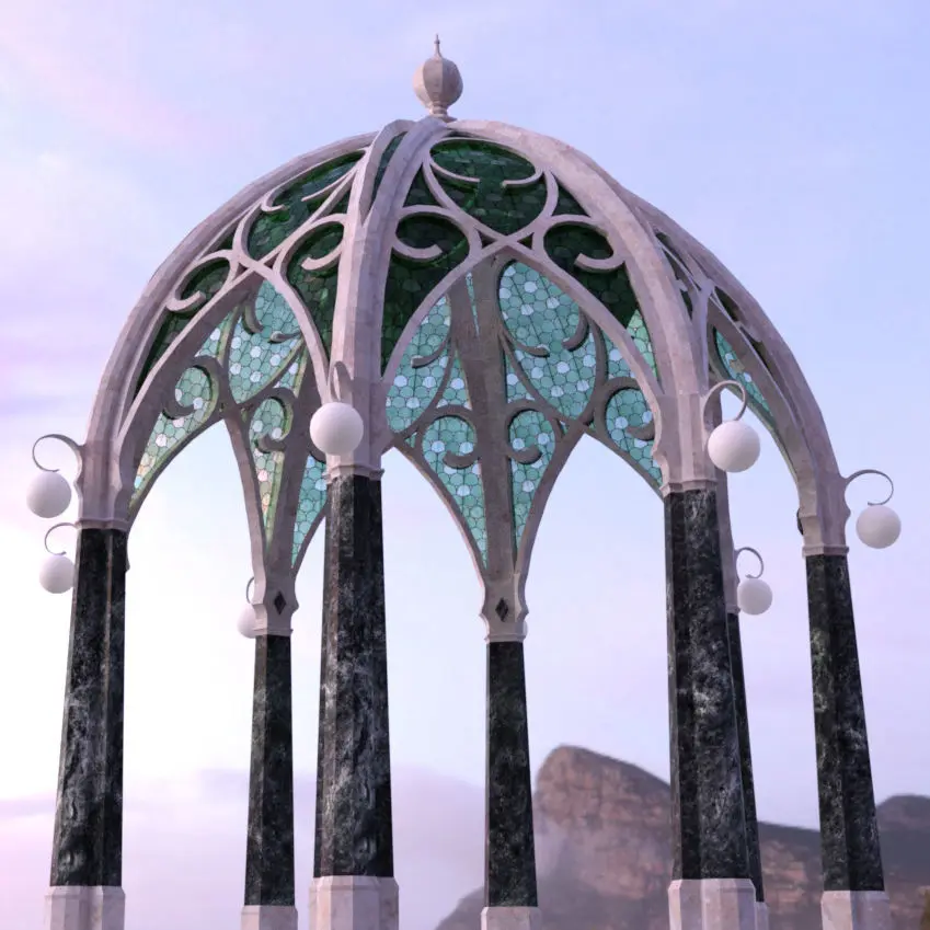 Model (.obj and .dae) of an ornate, elven style dome supported by eight pillars. Includes an ocatagonal base section as a separate model. In Daz a glass shader is needed to make the ceiling translucent, and the included texture can be applied to the glossy colour layer in order to create the deired effect in iray renders, as per the sample images. Textures are included but the model look just as good with other textures applied. The glass bits can also be hidden to make an open structure.