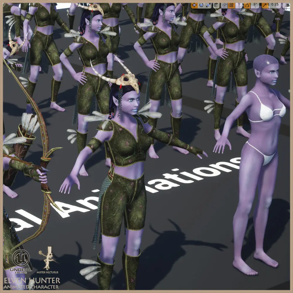 Number of characters: 2 basic character blueprints, 11 "skeletal meshes" including body, hair, animated bow, armor...