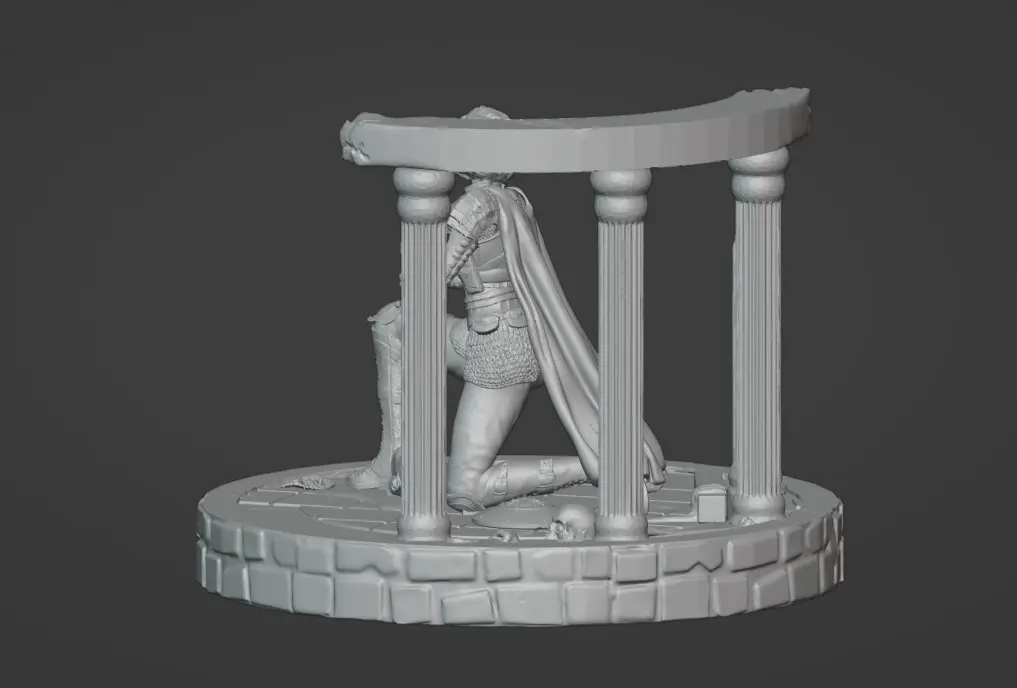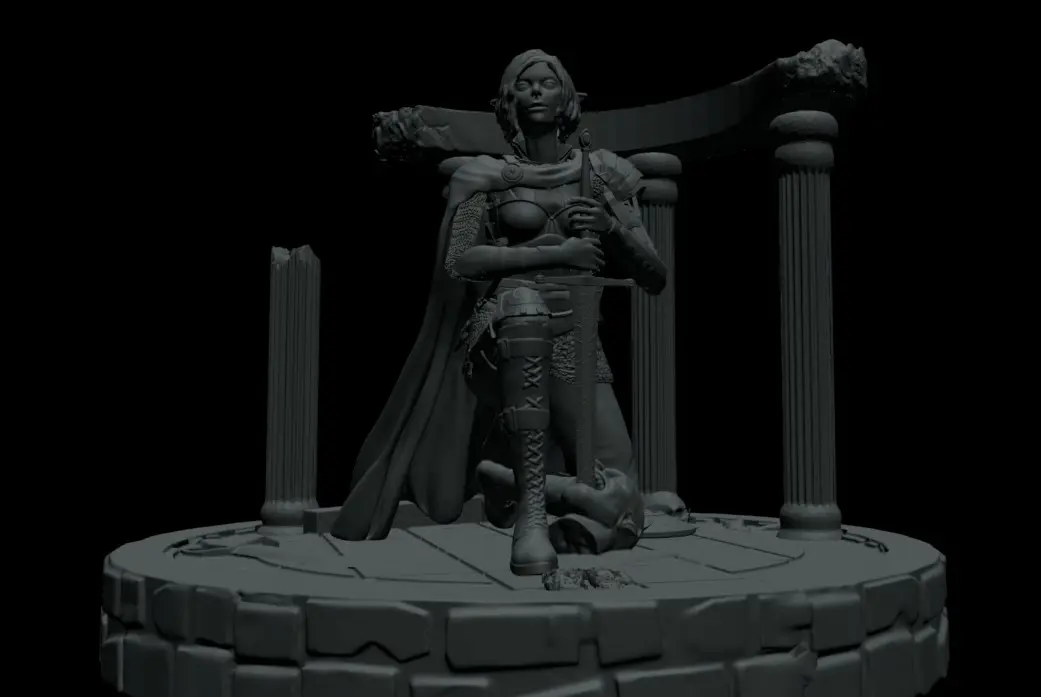 This detailed miniature portrays a warrior in full armor, kneeling solemnly amidst the ruins of an ancient battlefield. Clad in intricately designed armor with a flowing cape, she rests her hands on the hilt of her sword, which is planted firmly in the cracked stone floor. Surrounding her are broken columns and fragments of what was once a grand structure, enhancing the atmosphere of loss and determination. The model’s fine craftsmanship captures the moment of reflection before battle, making it an ideal addition to any collection or tabletop game, embodying strength, resilience, and quiet heroism.