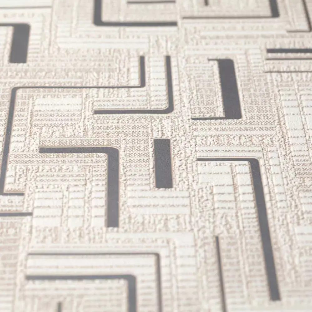 Look: Embossed taupe base with charcoal maze lines and woven grain