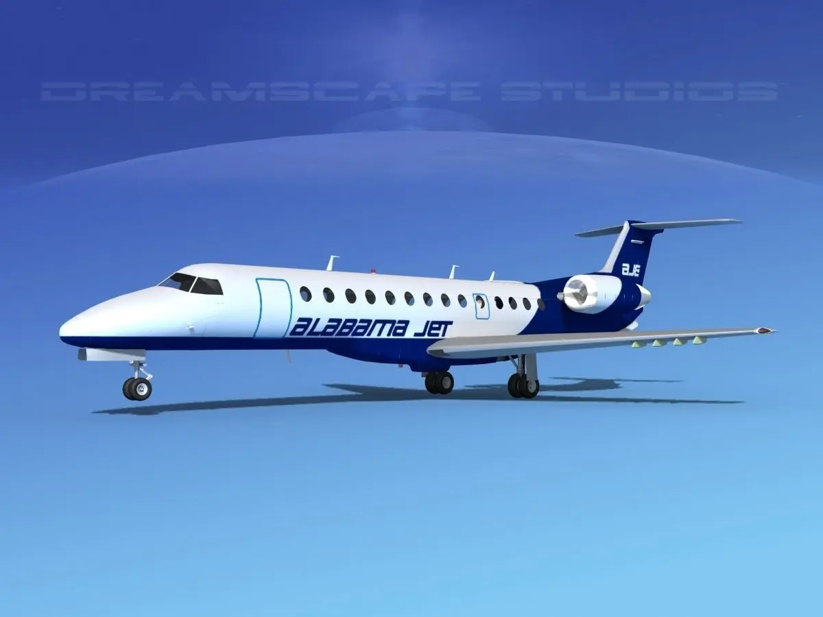 Embraer ERJ-135 Alabama Jet This model is built near to scale based on actual dimensions. It is fully textured and moderately detailed model. This model has retractable landing gear, animateable ailerons, flaps, elevators, rudder, and turbines. It comes in several different formats.