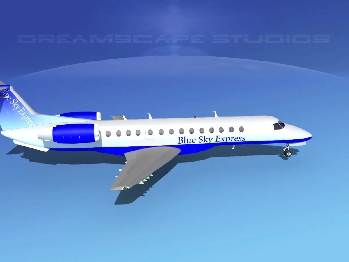 Embraer ERJ-135 Blue Skies Express This model is built near to scale based on actual dimensions. It is fully textured and moderately detailed model. This model has retractable landing gear, animateable ailerons, flaps, elevators, rudder, and turbines. It comes in several different formats.