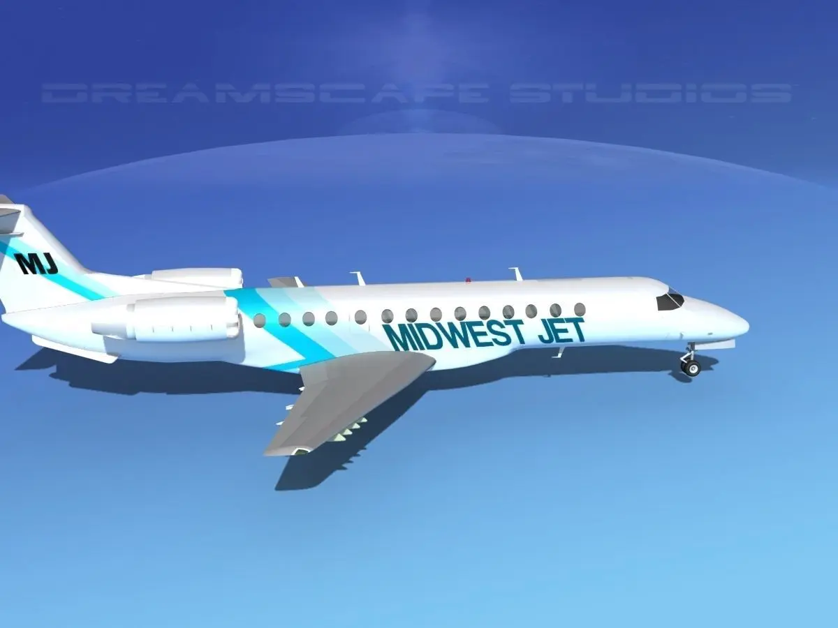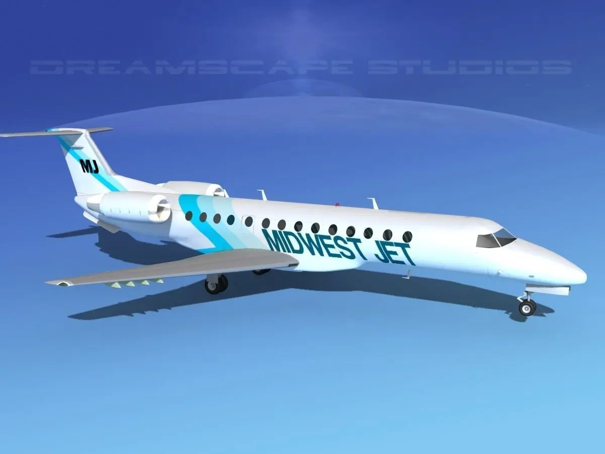 Embraer ERJ-135 Midwest Jet This model is built near to scale based on actual dimensions. It is fully textured and moderately detailed model. This model has retractable landing gear, animateable ailerons, flaps, elevators, rudder, and turbines. It comes in several different formats.