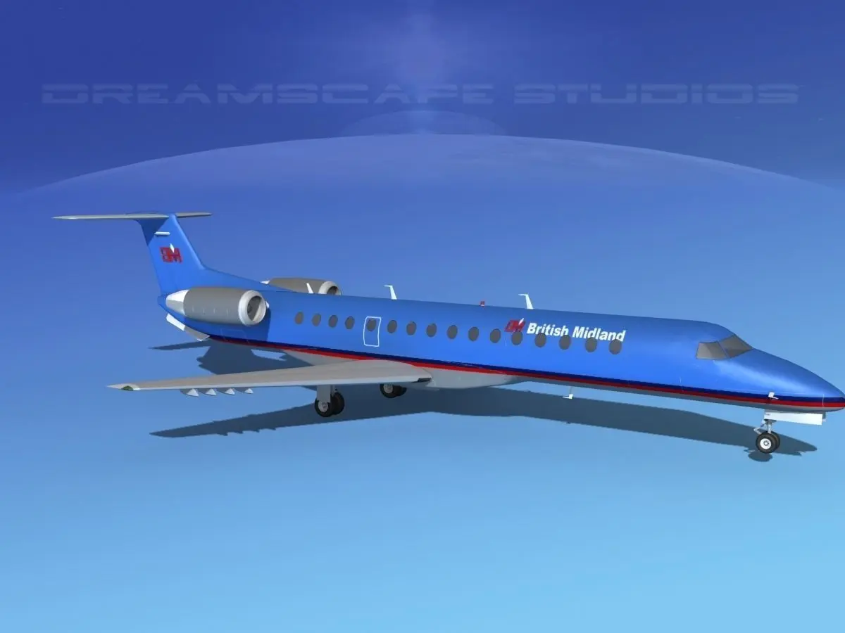 Accurate 3d model of Embraer ERJ-140 British Midland created near to scale (within 5%) according to the real reference. Native format is 3ds Max version 13. Model was exported to a wide variety of formats. Other formats are exported in one resolution. This can be further subdivided. Exported formats (3ds, lwo and obj) are prepared well to work correctly with every standard modeling software. Compatibility level with other software’s may be limited.This model has retractable landing gear, animateable ailerons, flaps, elevators, rudder, and turbines. Textures are included with all files. Previews were rendered using 3dsmax standard scanline. Model unit is variable depending on the model and references. The Embraer ERJ 140 family is a series of regional jets.