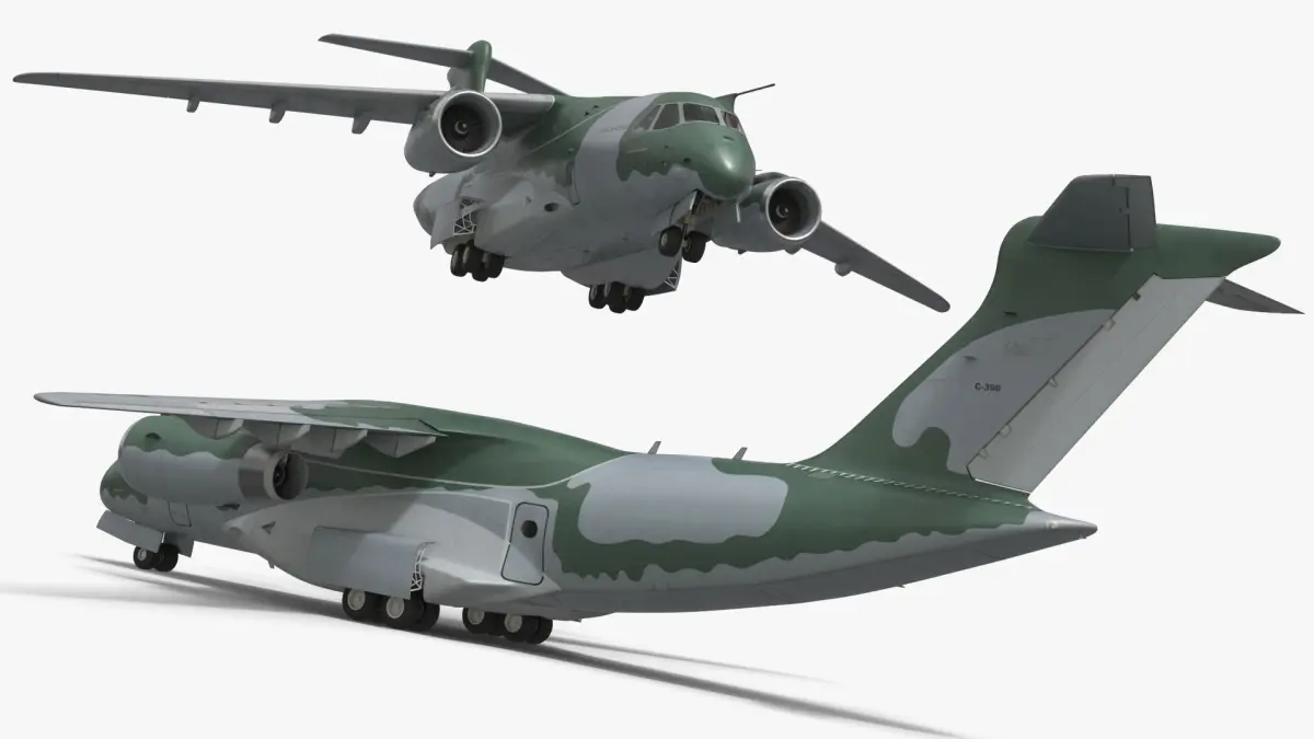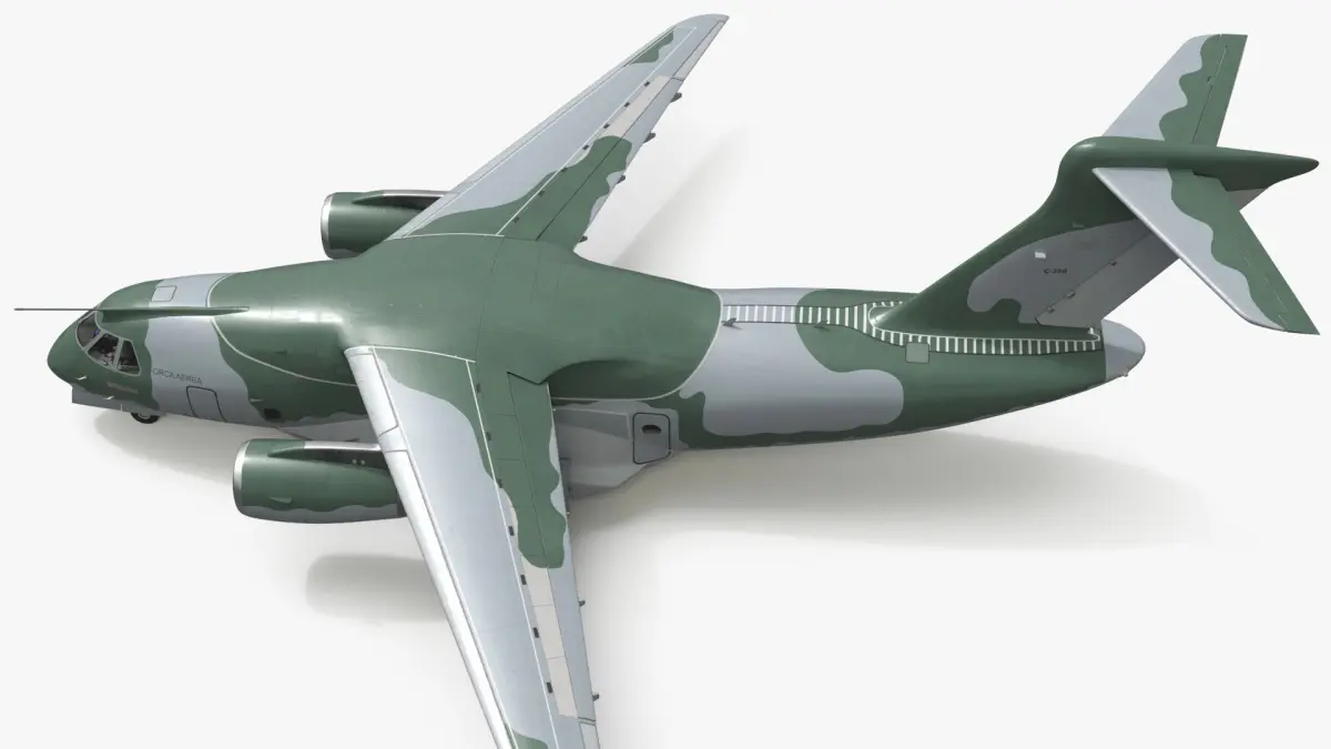 Embraer Millennium C 390 Military Aircraft Camo Simplified is a 3d model of a military transport aircraft, designed for versatile cargo and personnel transportation.