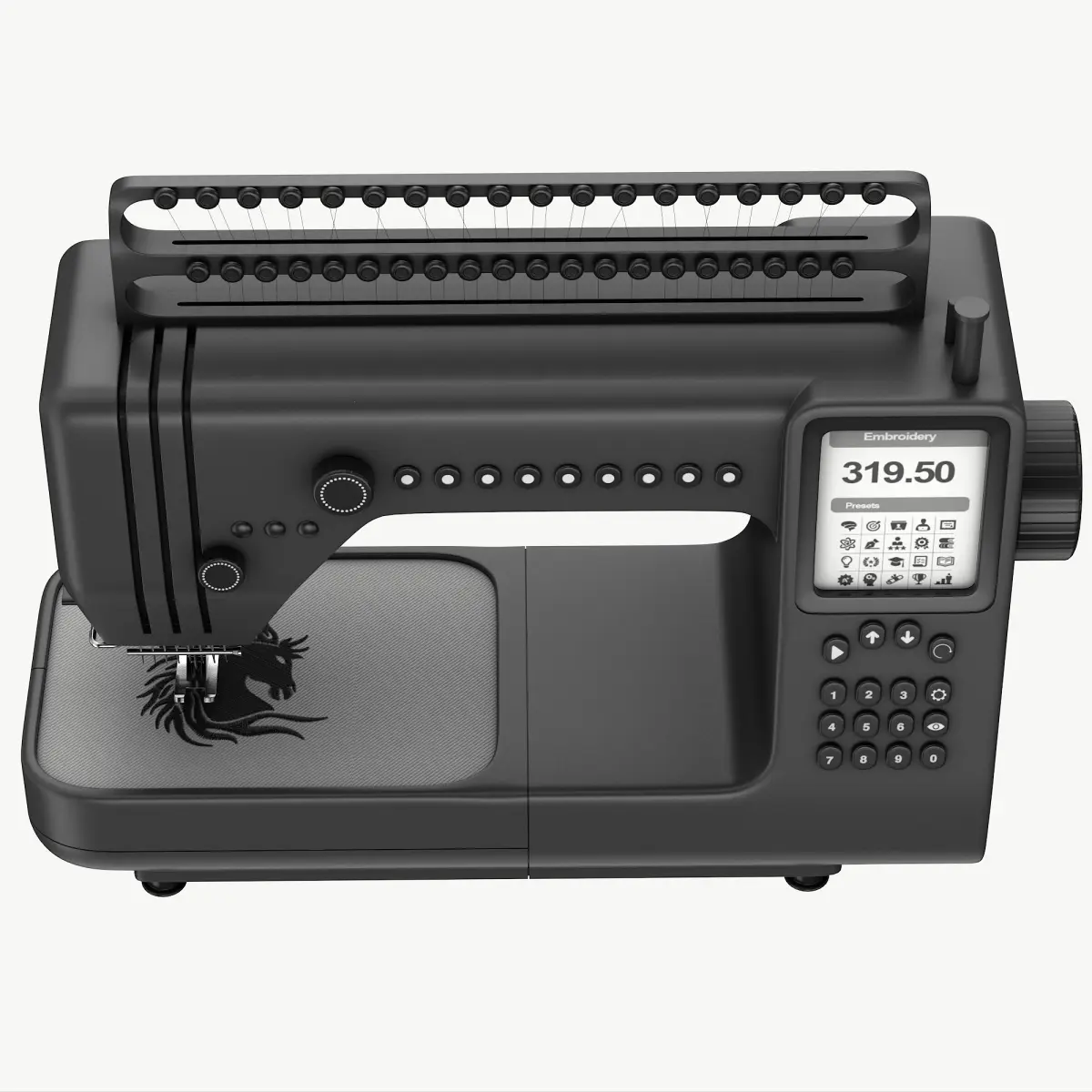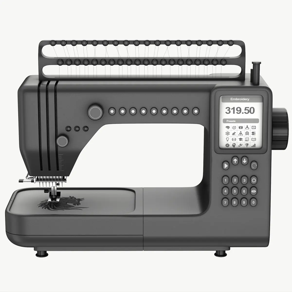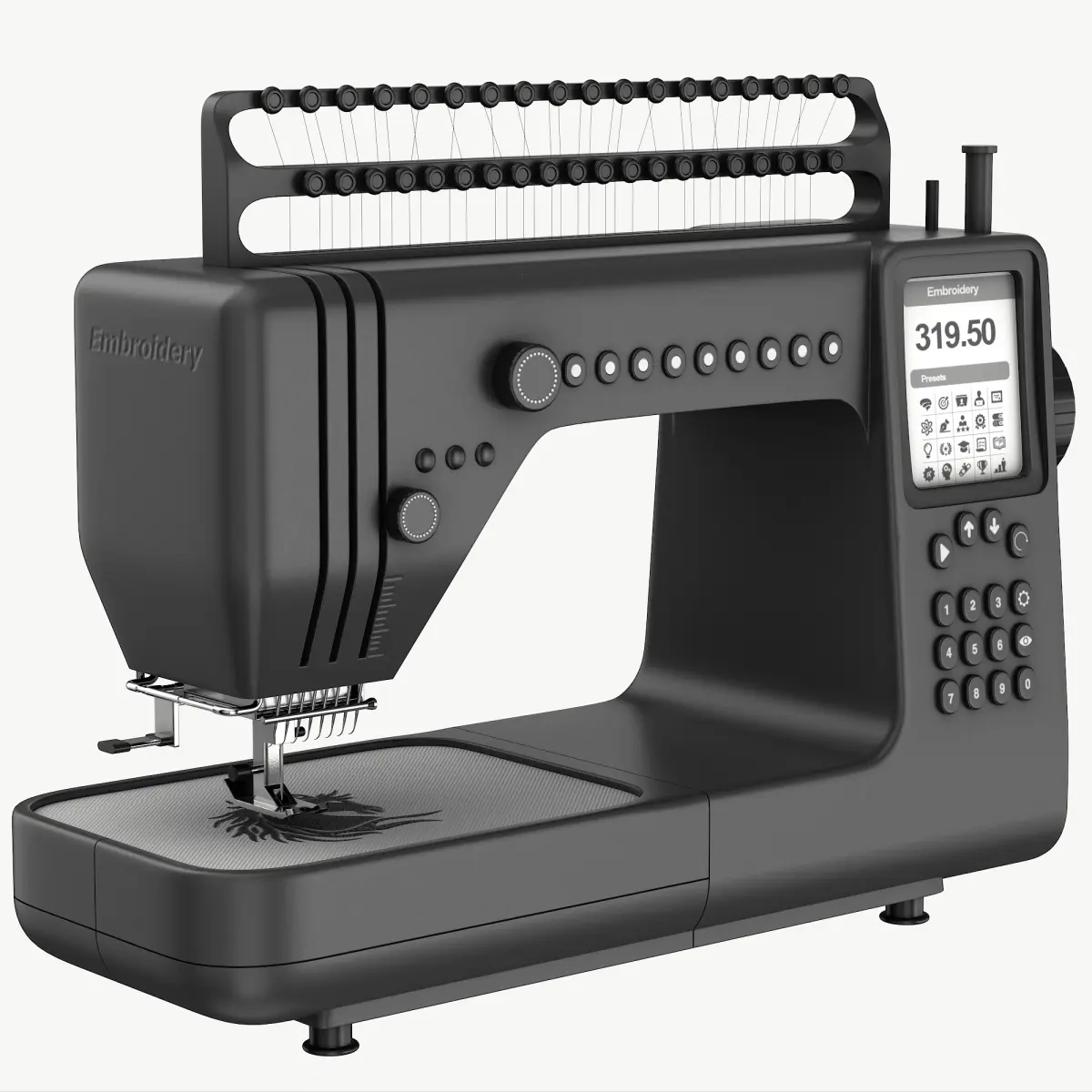 A high-tech embroidery machine in matte black finish, equipped with advanced features like automatic thread tension adjustment, catering to the needs of contemporary DIY enthusiasts. This model is a high end, photorealistic 3D model, that will help you to add realism to your project. The model is suitable for any visual production - broadcast, high-res film closeups, advertising, games, design visualisation, 3d print, etc. The model was initially created in 3Ds Max 2024 and rendered using V-ray for 3Ds Max. All geometry and visual aspects of the model are optimised to give you the highest possible quality for renders. There is no post-production used on any of the renders you see.
