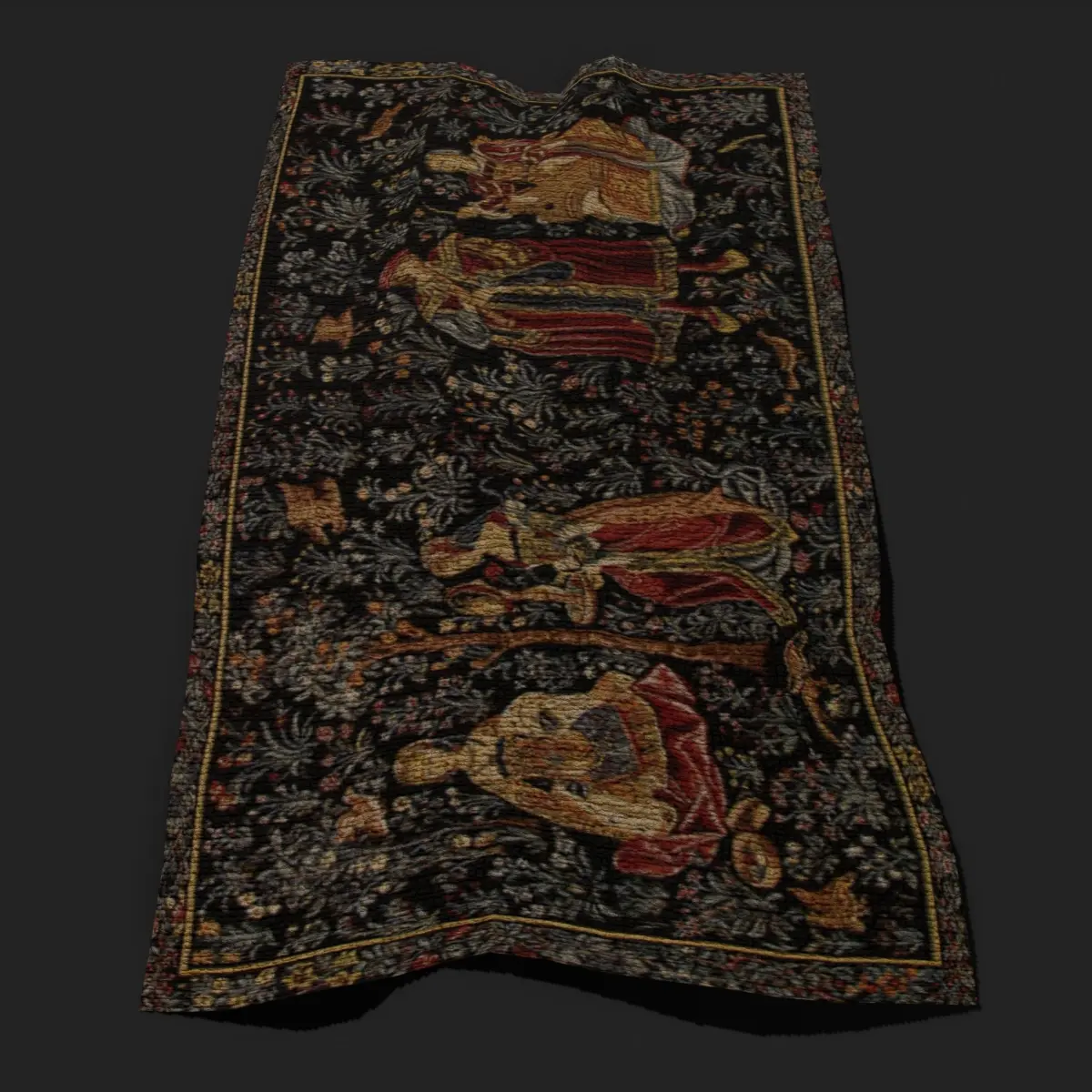 Embroidery Tapestry 3D Model. PBR Texture available in 4096 x 4096 Maps include : Basecolor, Normal, Roughness, and Metallic. All Preview renders were done Marmoset Toolbag 3.08 Scaled to real world scale. Includes 2 Models 1 Material. Customer Service Guaranteed. From the Creators at Get Dead Entertainment. Please like and Rate! Follow us on FaceBook and Instagram to keep updated on all our newest models. About the Artwork: We often think of Medieval or Tudor households as having simple and sparse belongings but the squires, land owners and court members had access to imported goods from the Orient. Use it on the floor, or hang it on the wall. The Embroidery tapestry is a late 15th century French tapestry originally woven on a high warp medieval tapestry loom. The typical mille fleurs background of the period has flowers and plants known for their real and symbolic characteristics.