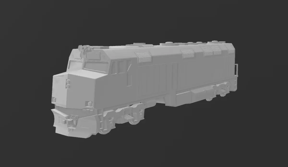 3D model of the EMD F40PH diesel-electric locomotive. This model is optimized for 3D printing and does not include interior details. This is the only simple easy to print 3D model of the EMD F40PH available. Print flat with standard supports (zigzag pattern recommended). The model is designed at a 1:100 scale.
