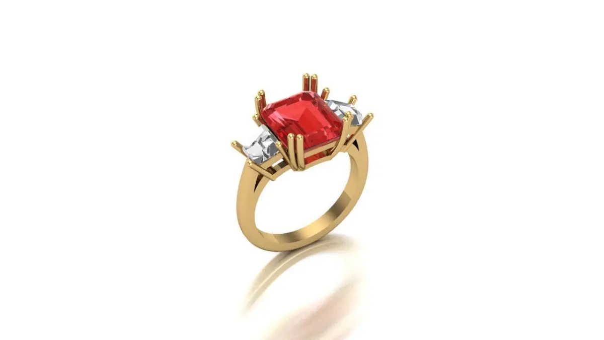 Flanking the center stone are two smaller side stones, likely diamonds, each cut in a baguette or trapezoid shape. These side stones, with their elongated and geometric forms, complement the emerald cut center stone, adding a touch of contemporary elegance and balance to the design. Their placement creates a sense of symmetry and harmony, enhancing the ring's overall aesthetic.