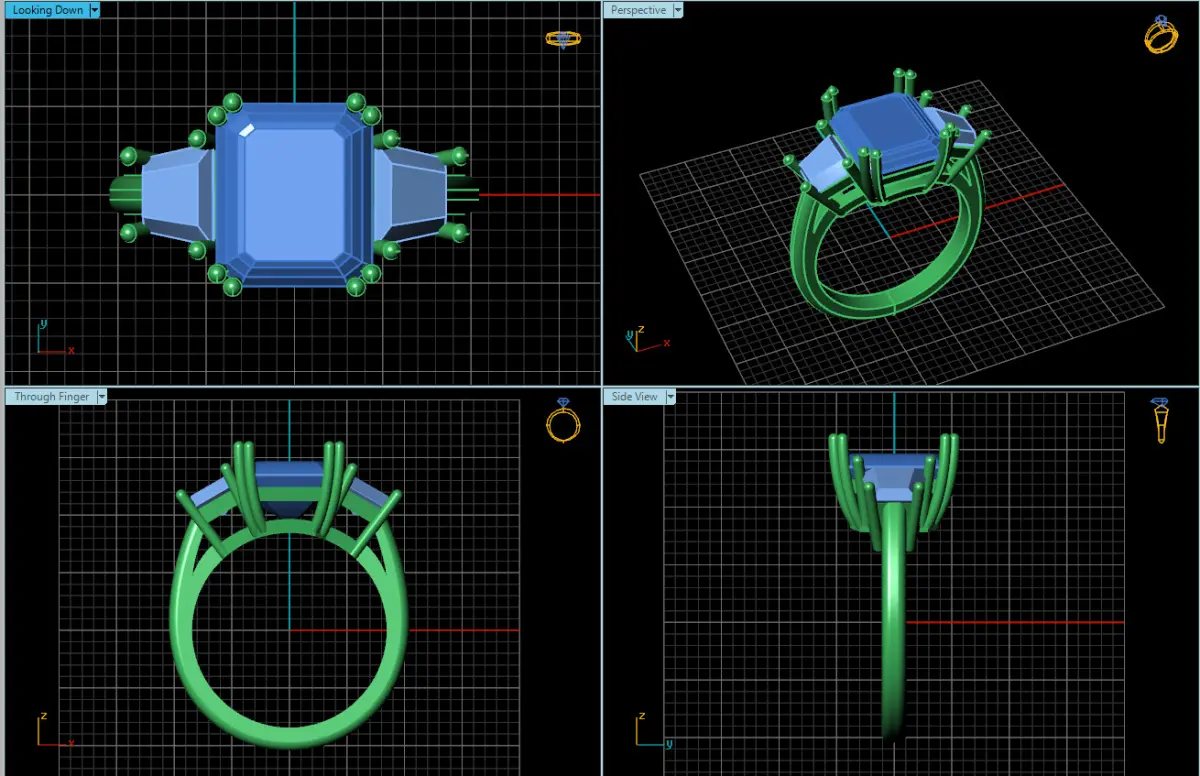 The side stones are also set in prong settings, similar to the center stone, allowing them to sparkle and shine with every movement. Their presence adds a touch of brilliance and highlights the center stone's unique beauty. The uniformity of the setting ensures that the stones appear as a cohesive unit, creating a sense of balance and harmony.