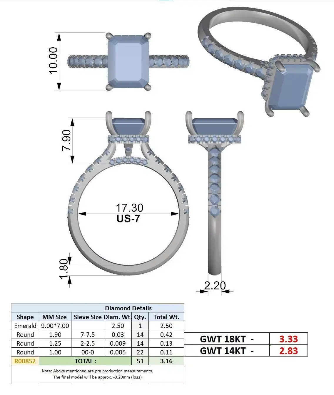 The emerald cut center stone is secured with a well-balanced prong setting designed to maximize light reflection while maintaining excellent structural durability for everyday wear. Pavé diamonds along the band further enhance sparkle, producing a refined and high-end aesthetic ideal for engagement and fine jewellery pieces.