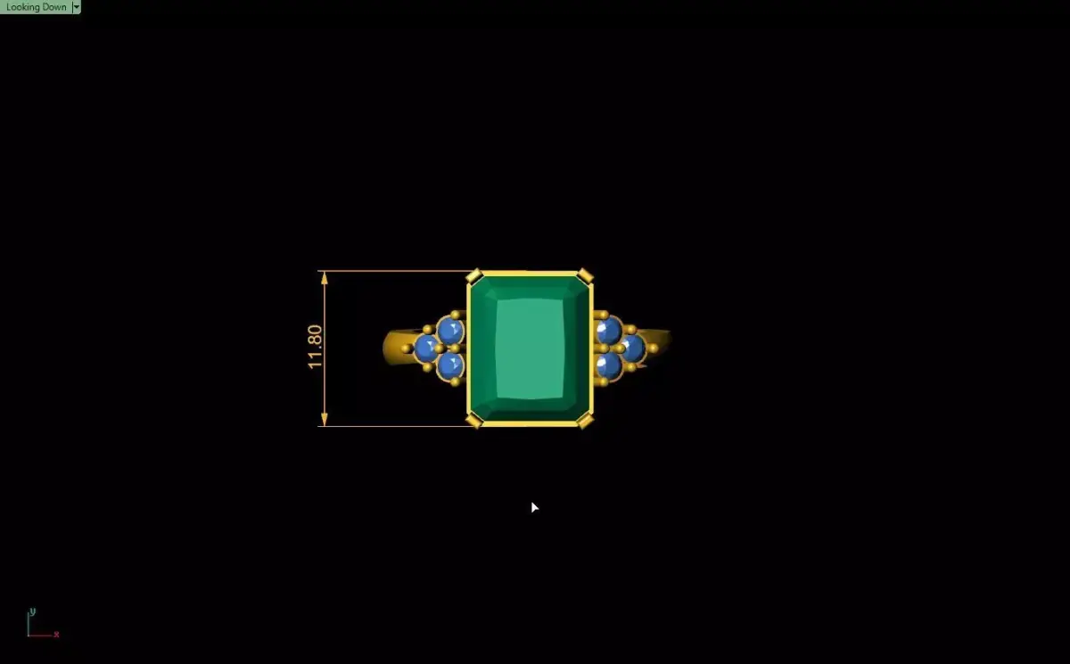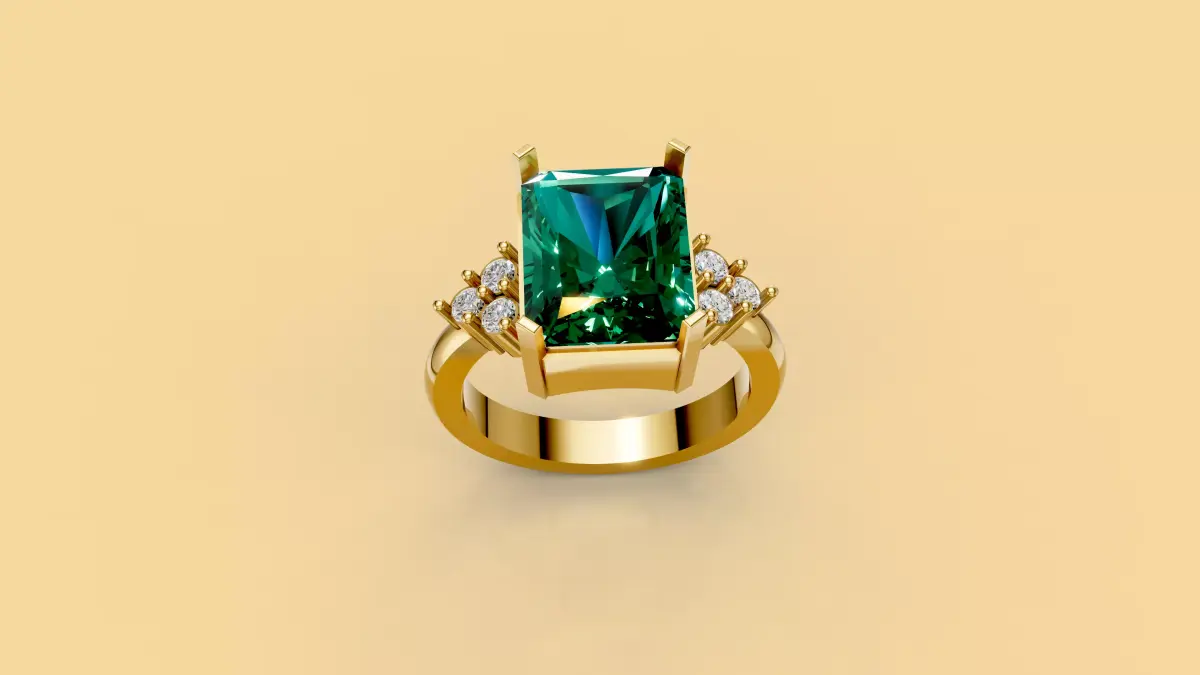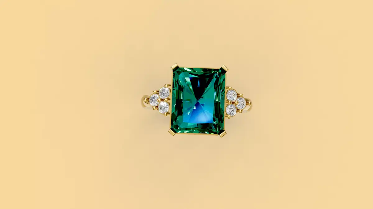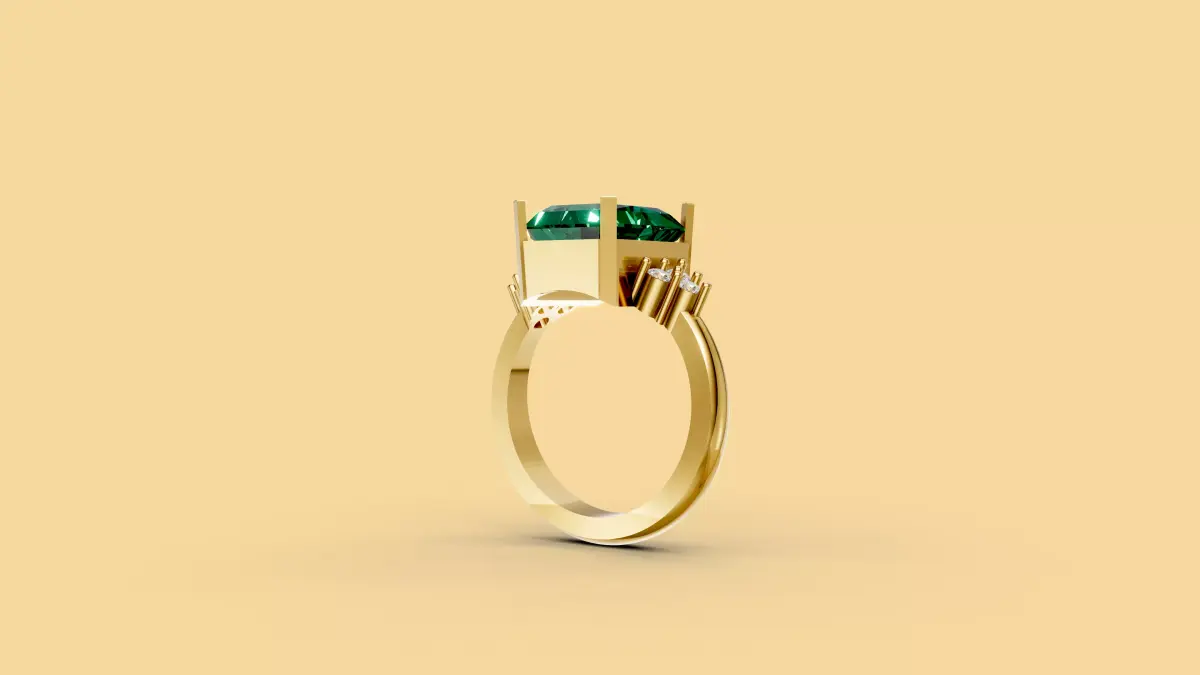 This is a high-quality 3D printable ring model featuring a stunning emerald-cut center gemstone held in a modern elevated 4-prong setting. The band includes an elegant cluster of three micro-diamonds on the side, adding a luxurious touch to the design.