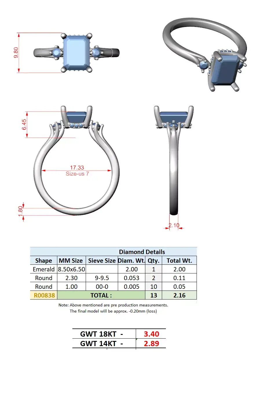 Key Features• Emerald-cut center stone setting• Two round side stones in balanced layout• Secure prong setting construction• Manufacturing-friendly geometry• Comfortable band proportions for daily wear• Smooth surfaces suitable for polishing• Accurate stone seating for production workflows• Easily customizable for stone size variations