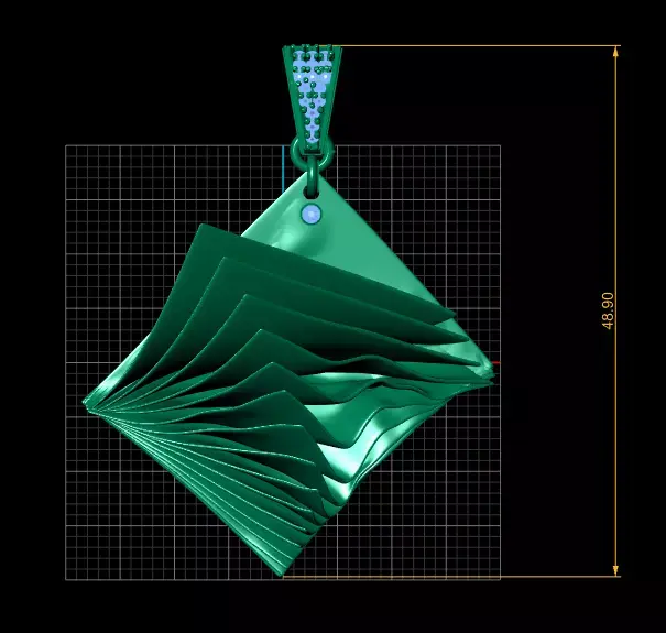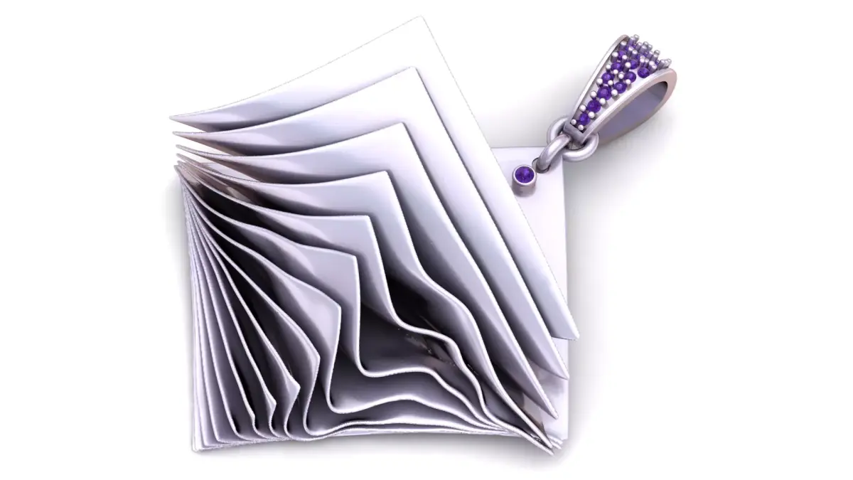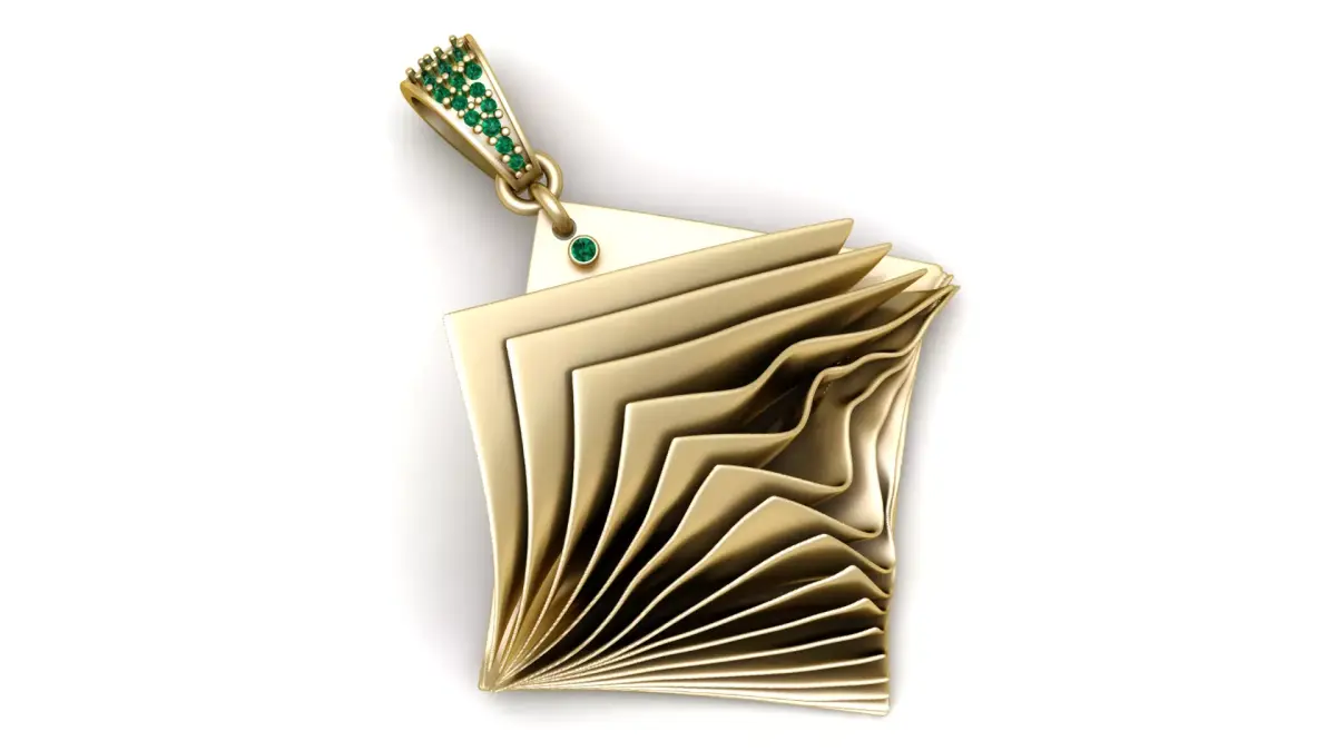 This sophisticated pendant showcases a layered, folded geometric form inspired by sculptural origami. Crafted in polished gold, the cascading panels create depth, movement, and dramatic light reflection. A refined bail set with vivid green emerald gemstones adds a luxurious accent, while a single emerald detail on the top plate enhances balance and elegance. Perfect for modern, architectural, and high-end jewelry collections.