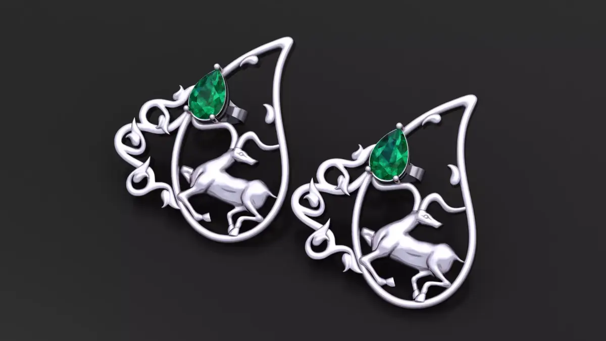 The Emerald Gazelle Earrings are a breathtaking blend of nature, grace, and fine craftsmanship — an artistic tribute to freedom and elegance. Designed in Rhino3D and ZBrush, these earrings feature a delicately sculpted gazelle captured mid-leap within an intricate gold frame inspired by flowing vines and organic curves.