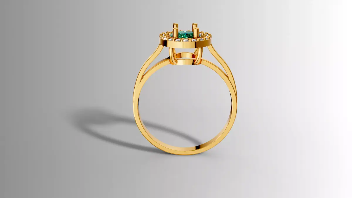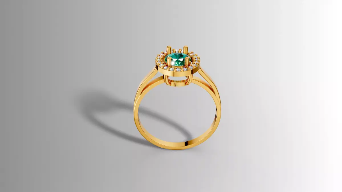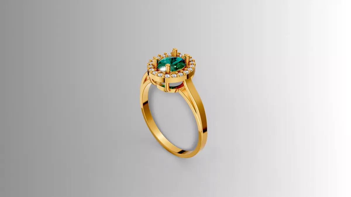 Precisely modeled in Rhinoceros, this elegant halo ring showcases a refined fine jewelry design centered around a brilliant round-cut emerald-green gemstone. The central stone is securely held by polished yellow gold prongs and surrounded by a delicate halo of diamond-like round stones, enhancing brilliance and depth. The smooth, tapered band in yellow gold provides a balanced and timeless aesthetic, combining classic elegance with modern precision.