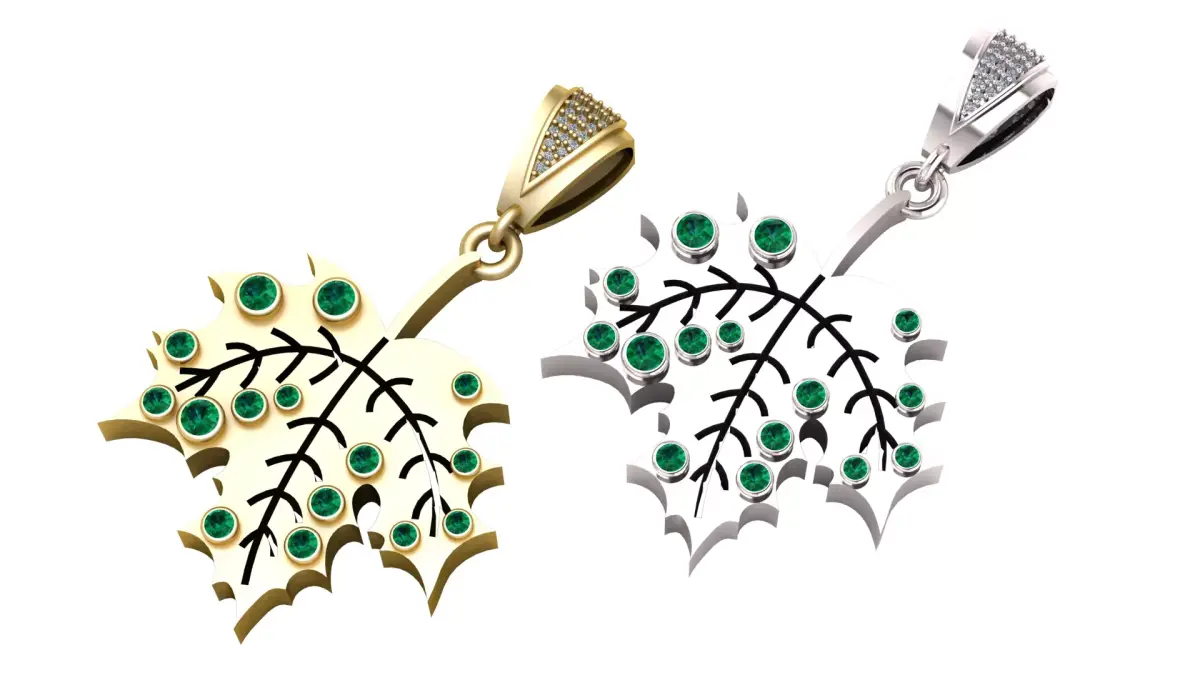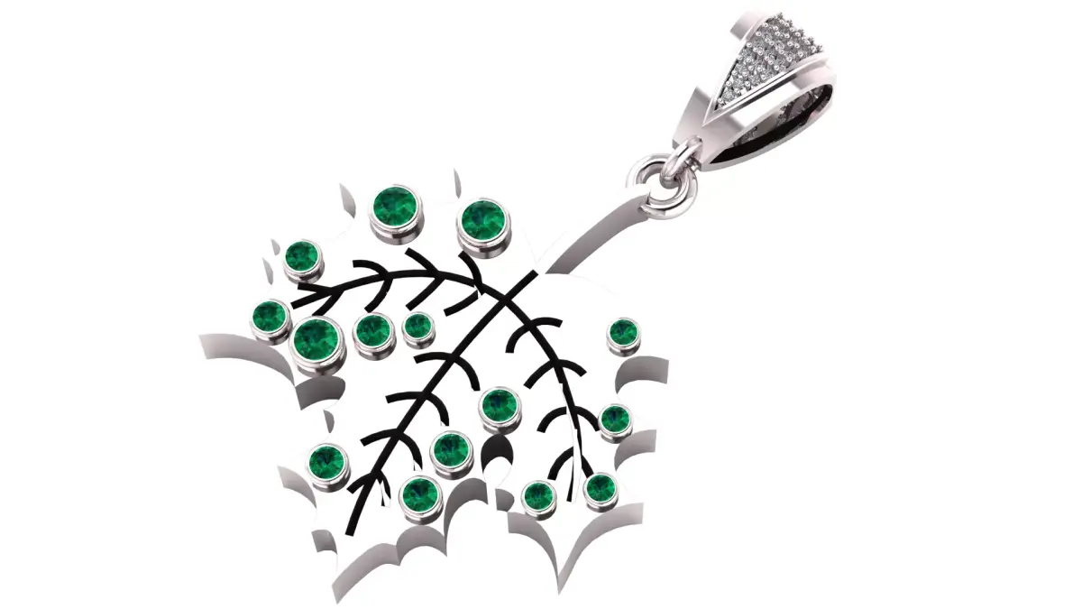 A graceful gold pendant shaped like a leaf, adorned with vivid green gemstones. The leaf veins are finely detailed in black, enhancing the natural aesthetic, while the sparkling stones add a touch of luxury. The bail is encrusted with small white gems, completing the piece with elegance.