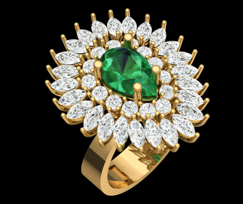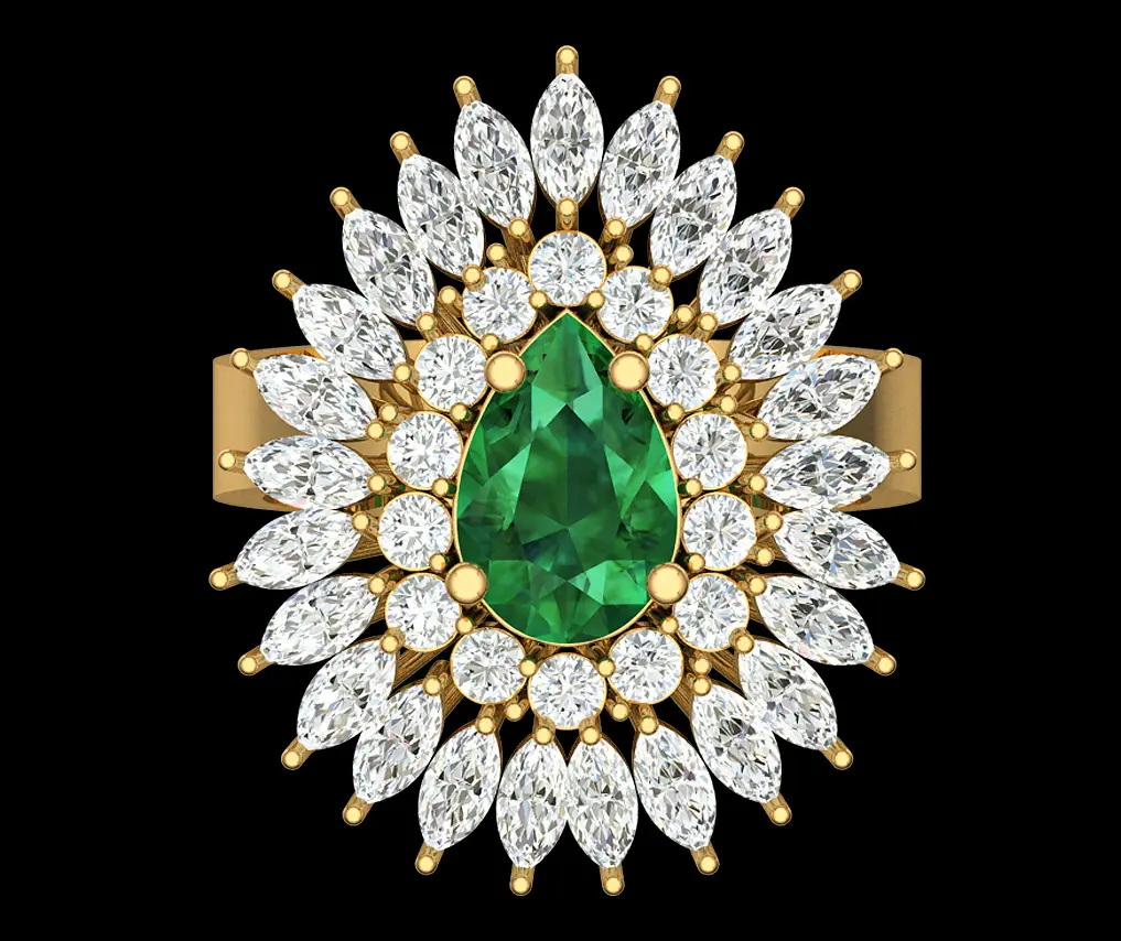A luxurious statement ring featuring a vibrant pear-shaped green emerald at its center, surrounded by two radiant layers of sparkling marquise-cut diamonds. Set in gleaming gold, the design resembles a dazzling sunburst, exuding elegance and sophistication.