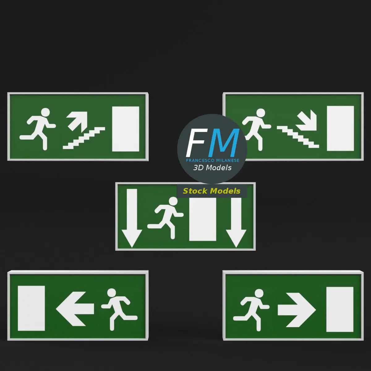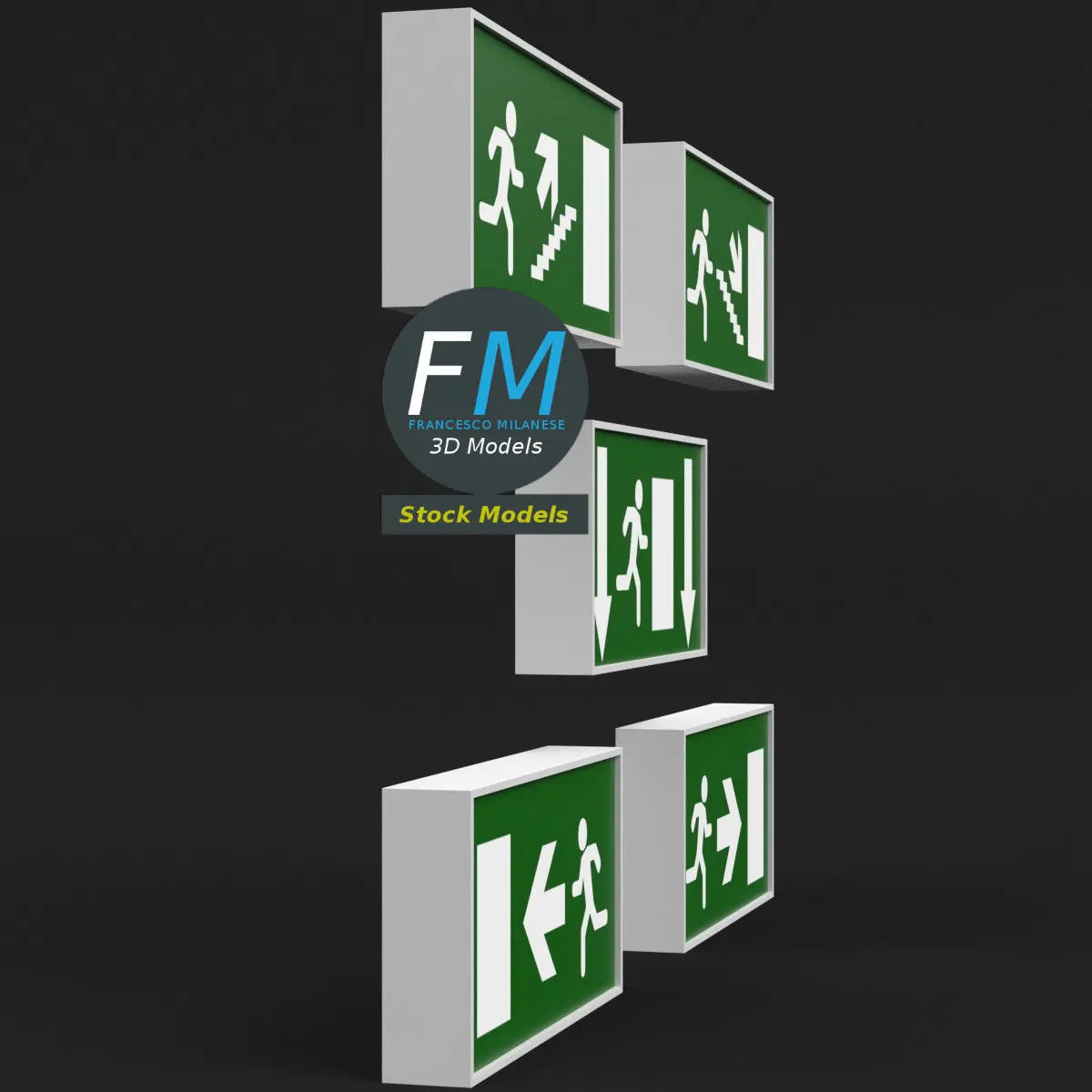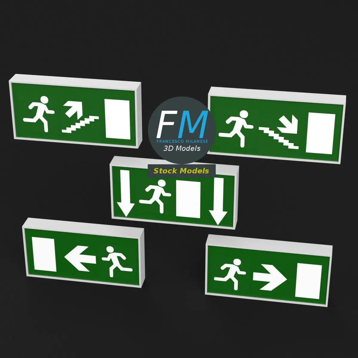 Emergency exit signs 3D Model. 10 individual objects (5 cases, 5 panels), sharing 2 non overlapping UV Layout maps, Materials (cases, signs; so, you can easily turn them in emitting panels) and PBR Textures sets. Production-ready 3D Model, with PBR materials, textures, non overlapping UV Layout map provided in the package.Quads only geometries (no tris/ngons).Easily customizable: UV unwrapped geometries, so you can create new Textures (or modify the existing ones) using the UV Layout maps provided in the package (as png with alpha).Each Object, Material or Texture provided in the package has a unique, meaningful name.Made in Blender 3.1 with a Cycles PBR shader with textures included (principled and Eevee compatible), then exported to OBJ and FBX; materials and textures made in Substance Painter, exported for PBR, V-Ray, Unity, Unreal.PROMO IMAGES: the first image has been rendered in Cycles for Blender; in particular, you can find 11+ promo images in this description: