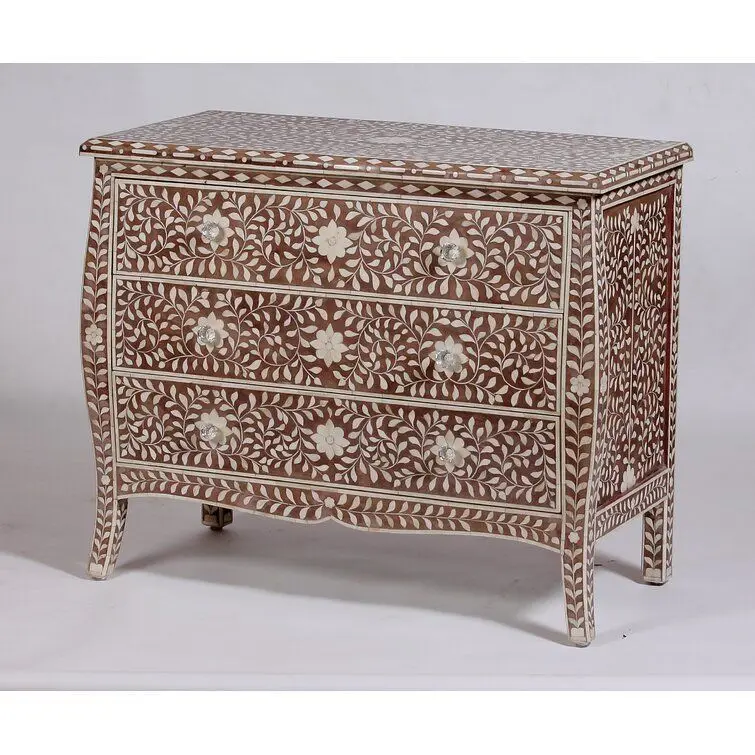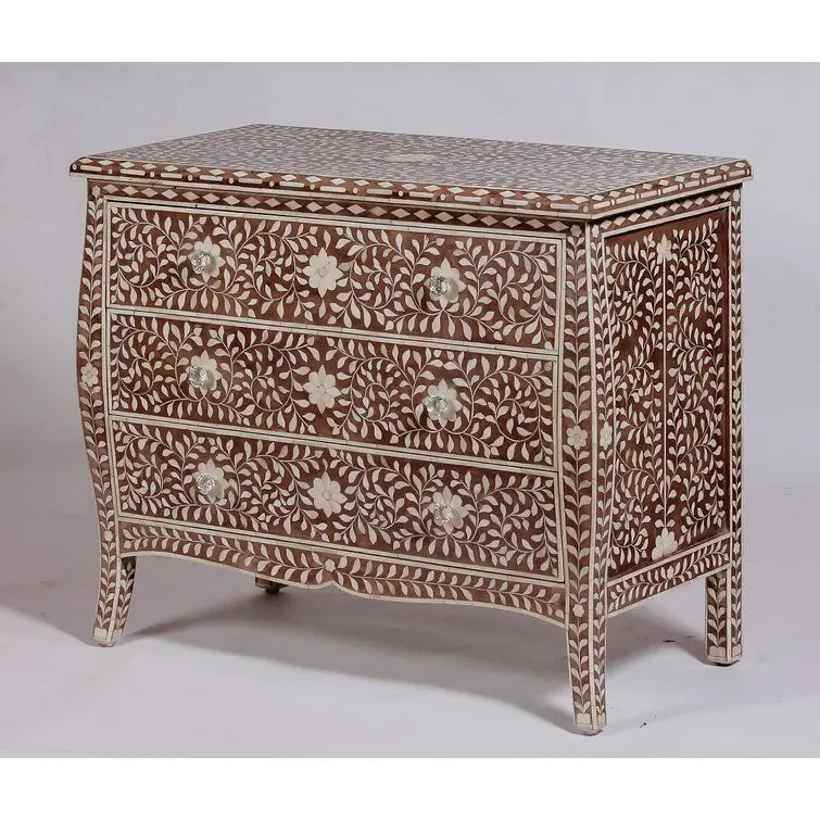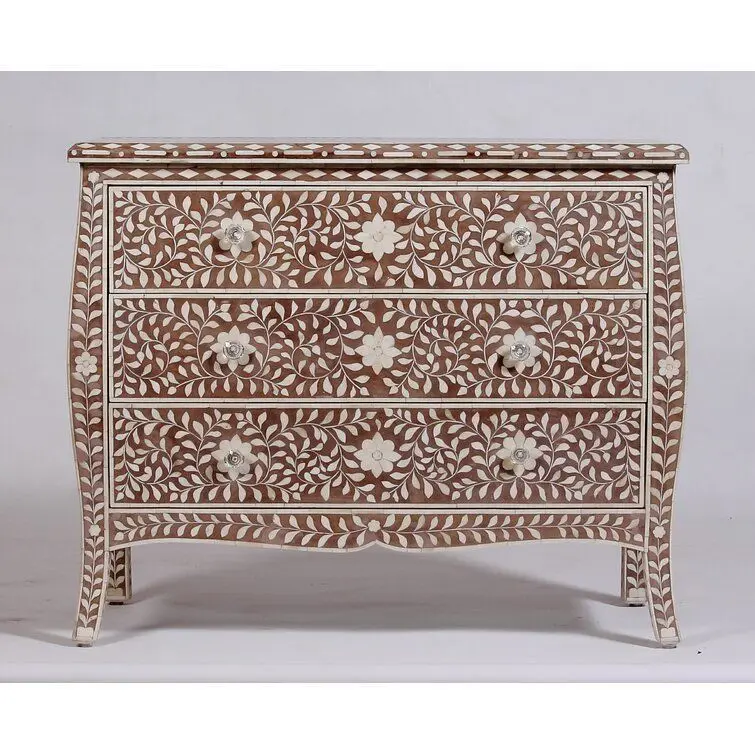 - From filling empty corners with personality to keeping essentials stored in reach and out of sight, accent chests offer a range of options to any interior space. This one helps you establish a global-inspired look in your home: crafted from solid wood, it showcases an allover pattern of trailing white vines, which contrast beautifully with the brown wood. Each of its three drawers is accented by two clear pulls, placed right in the centre of a white flower.