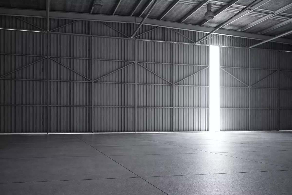 High-quality industrial warehouse / hangar interior 3D scene created in 3ds Max and rendered with V-Ray. The environment features a large empty space with corrugated metal walls, structural steel beams, roof framing, and a polished concrete floor with realistic reflections and light falloff. A strong directional light beam from the open door creates a cinematic atmosphere ideal for product shots, vehicle presentations, and industrial visualization.