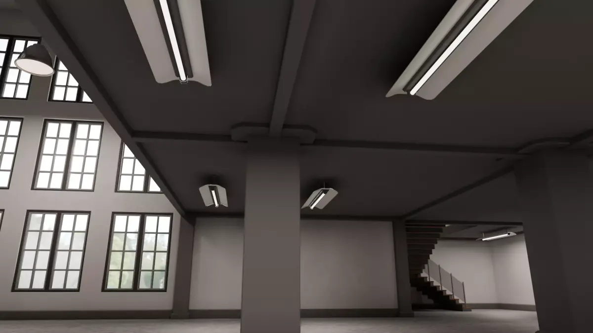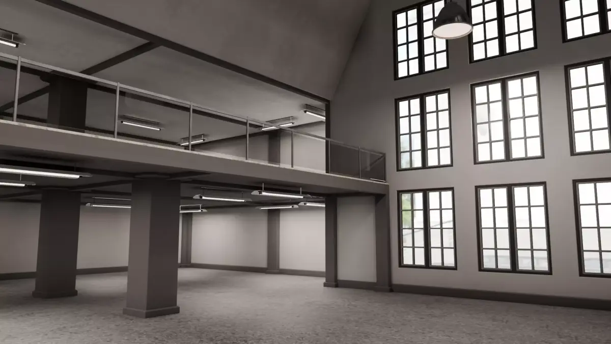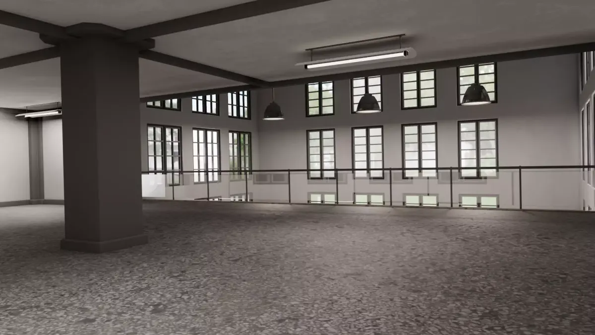 This product is a detailed industrial-style interior scene prepared for Blender Eevee, designed for real-time visualization, interior previews, and animated walkthrough renders.The scene features a spacious interior with large window openings, structural columns, upper and lower floor levels, and ceiling-mounted lighting fixtures. Materials and lighting are set up specifically for Eevee.Three cameras are included in the scene, each animated with dolly camera movement to present the interior from different perspectives. Preview animations are provided between the product images.