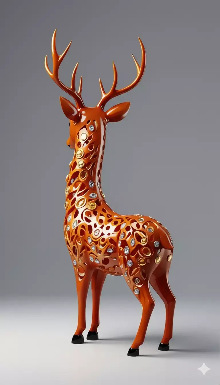 This 3D model reimagines a majestic stag as a work of art, blending nature’s elegance with opulent design. The sculpture features a shimmering amber-brown body with a glossy finish, adorned with intricate geometric patterns and sparkling silver and gold diamond inlays that catch the light dynamically. The stag’s elaborate antlers curve upward in sharp, organic shapes, while its expressive eyes and poised stance evoke grace and mystique.