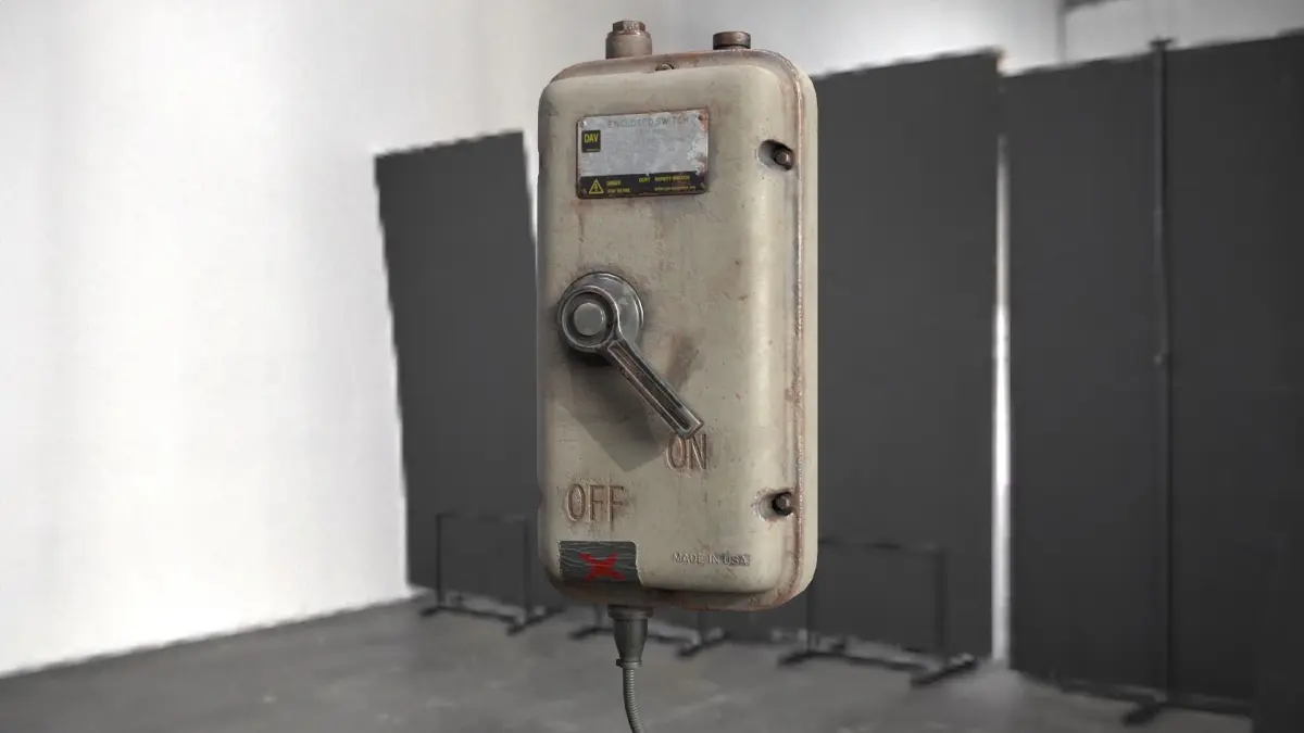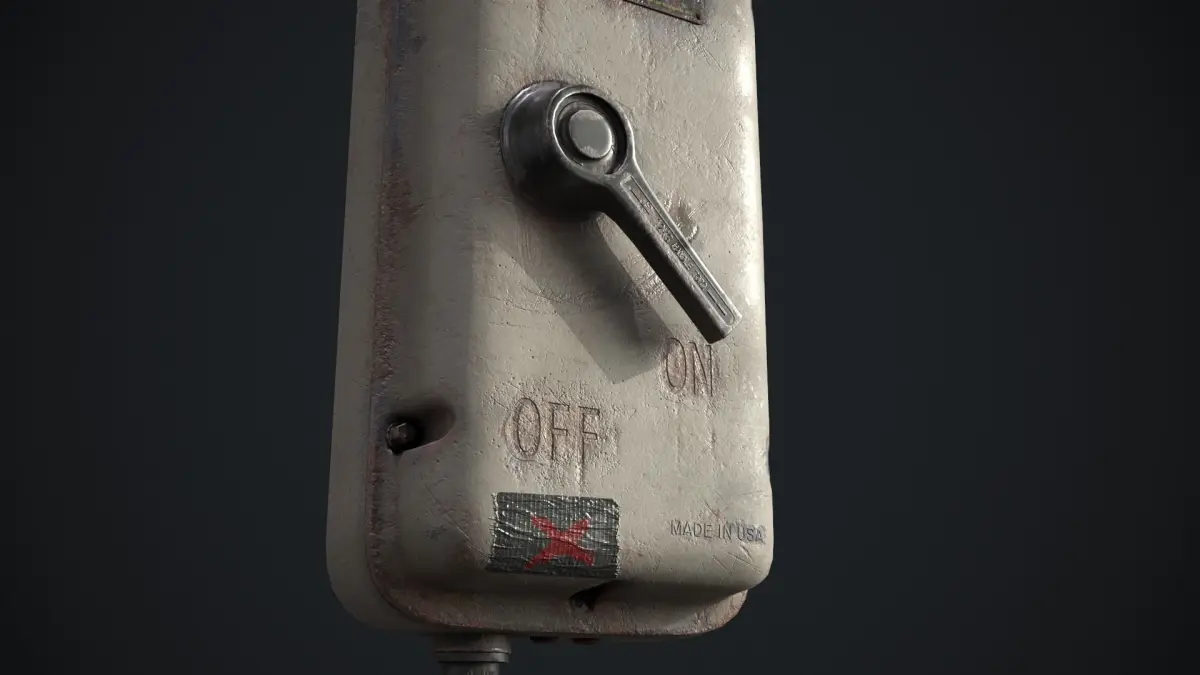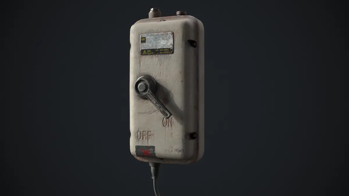 Old enclosed electrical switch prop. Three parts model, cable, main unit and the lever are separate objects. The model has two texture sets, one for the cable and one for the main unit. Main unit has 4K textures in saved in .PNG with metal-roughness workflow.