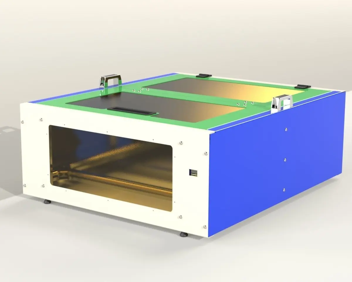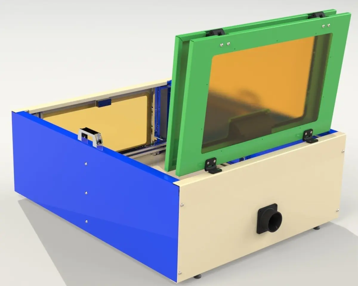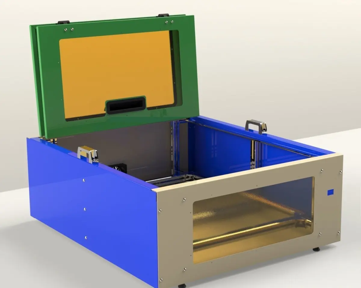 This is Enclosure for any type of machine CNC or Laser. It was designed with an outer wall using sheet metal and the inside frame using aluminium extruded tube.In the top I used double gate which can be opened with the help of the hinges in the rear.The top gate and the front sheet have open area covered using polycarbonate sheet to facilitate the vision.The enclosure include an exhasut fan at the back.The size is 882 x 742 x 224 mm