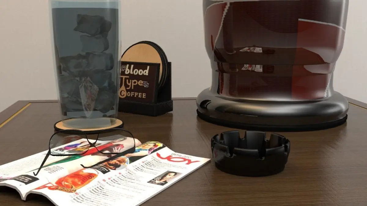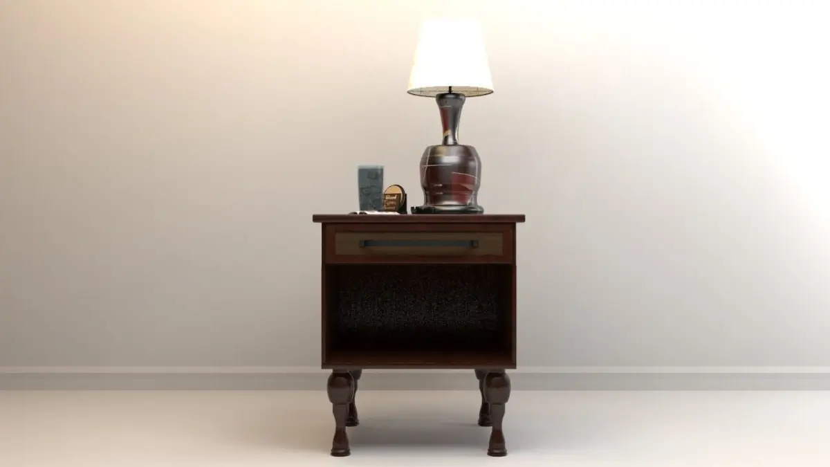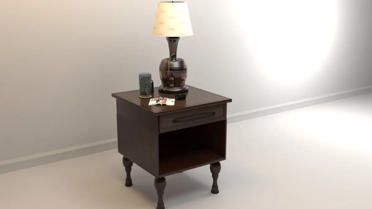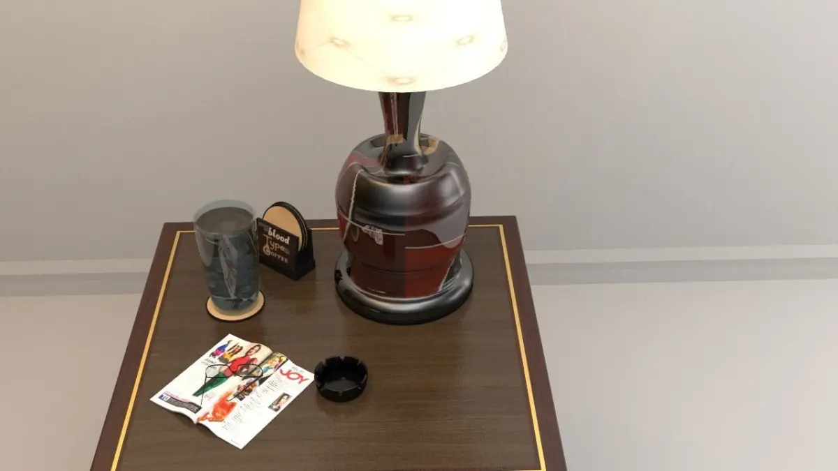 Traditional endtable with inlay.Functional drawer, ready to animate as a group. lamp, magazine, tea glass, glasses, coasters, and ashtray included.Tea Glass includes the Ice Cubes.