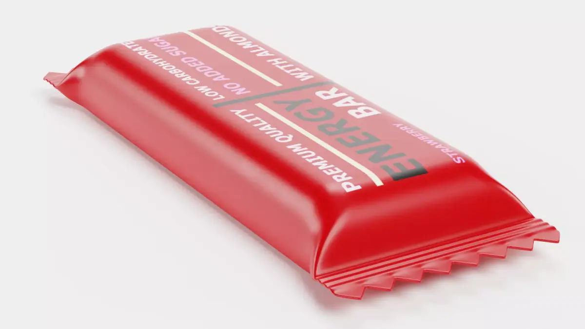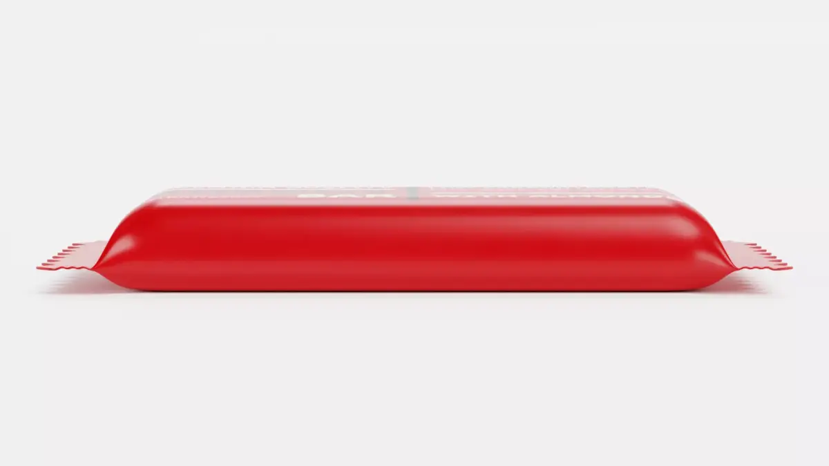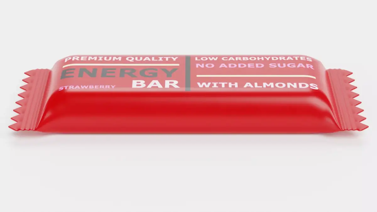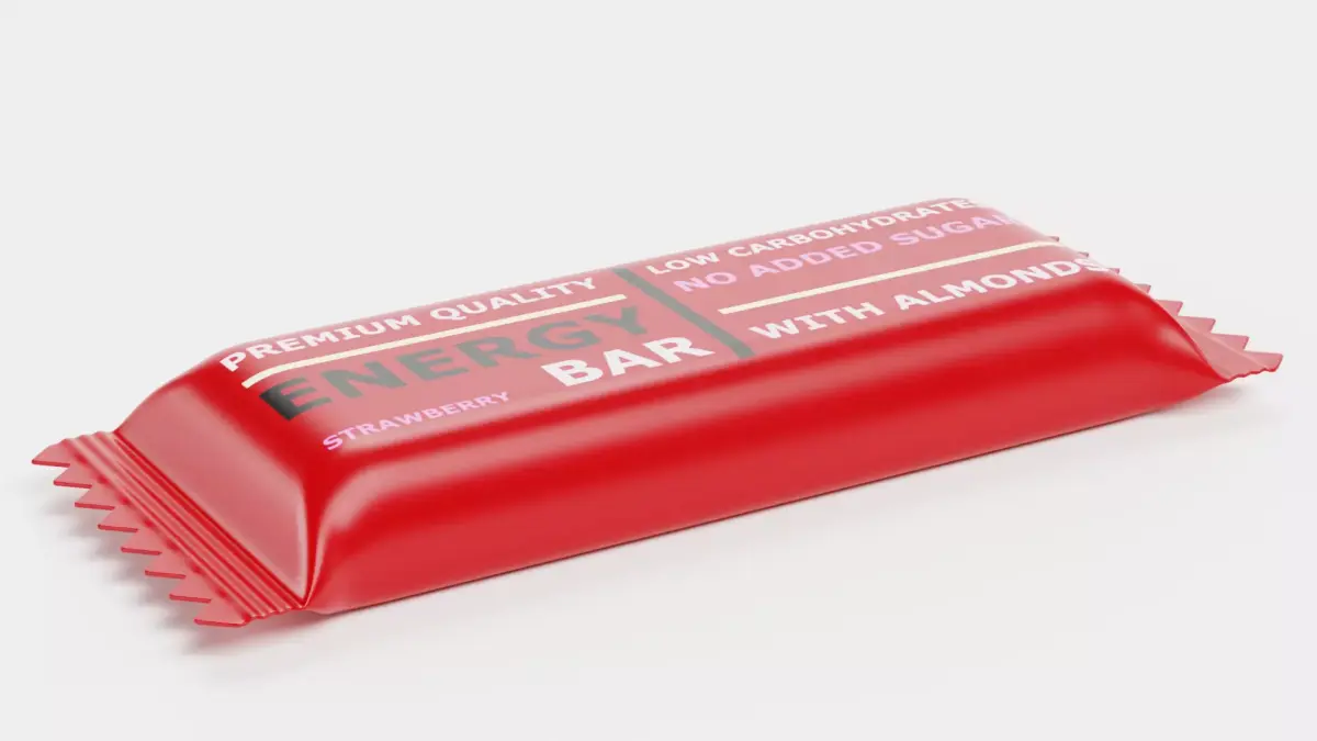 A realistic 3D model of a Energy Bar sealed flow wrap package designed as a brand-neutral supplement container with clean proportions and a production-ready look. This concept emphasizes modern, minimal design and accurate form factor, representing a timeless, professional packaging aesthetic for sport nutrition packaging – without any brand association.