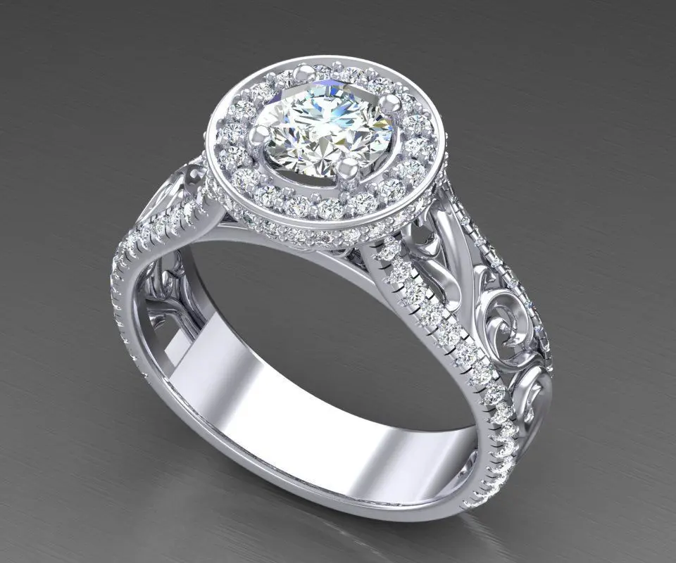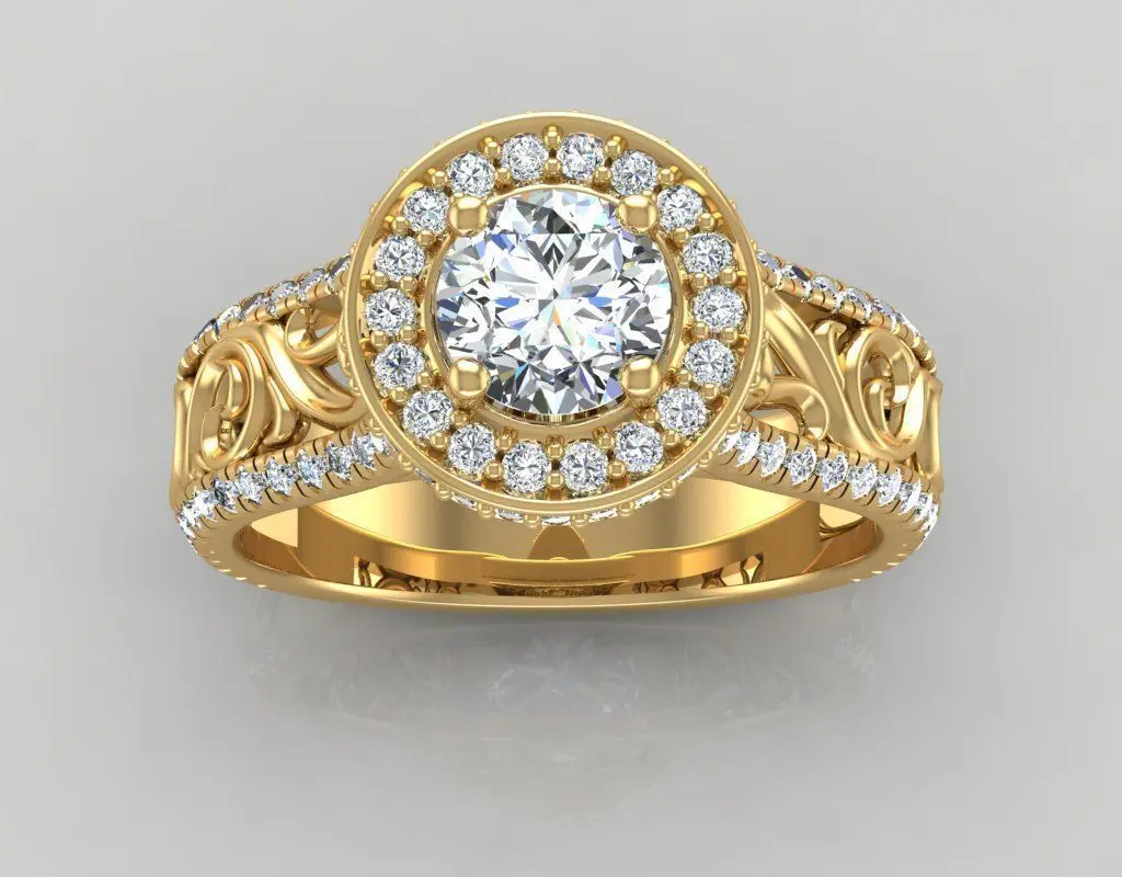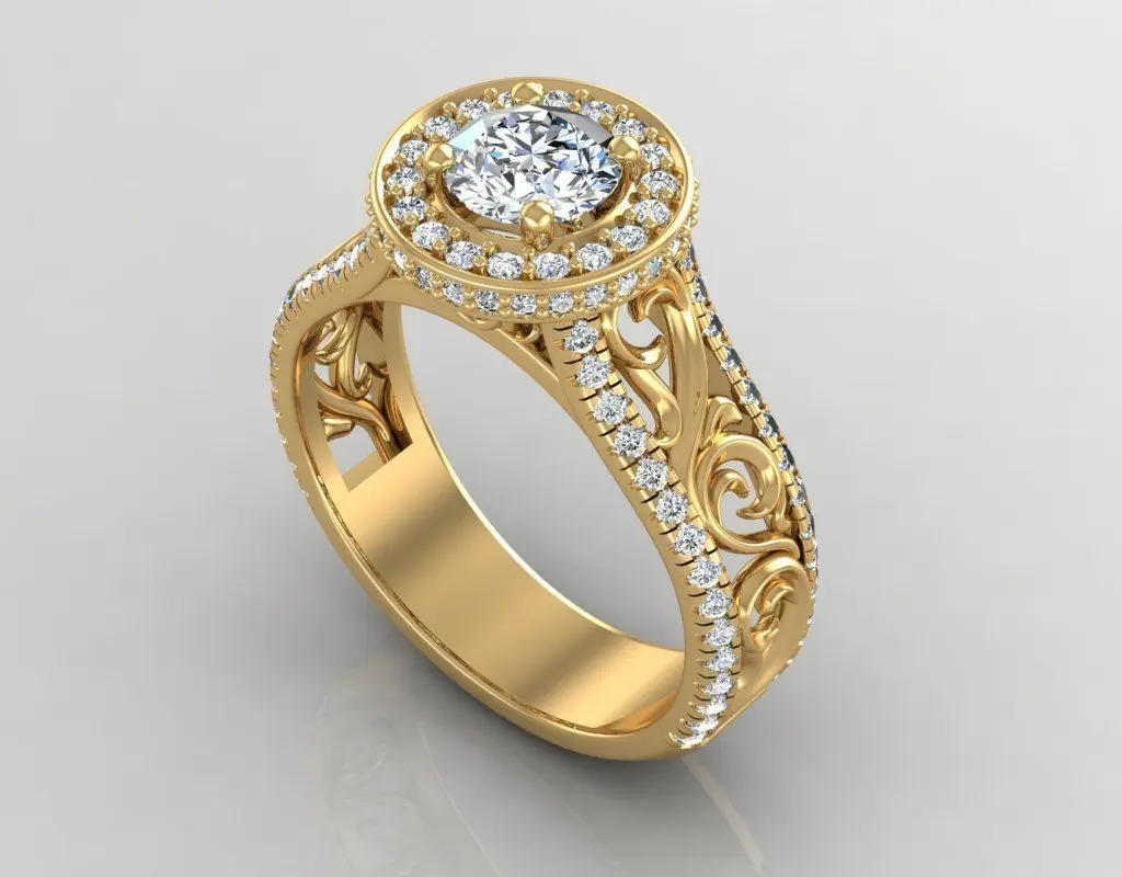 Elegant engagement ring with a halo on the top and filigree design on the sides