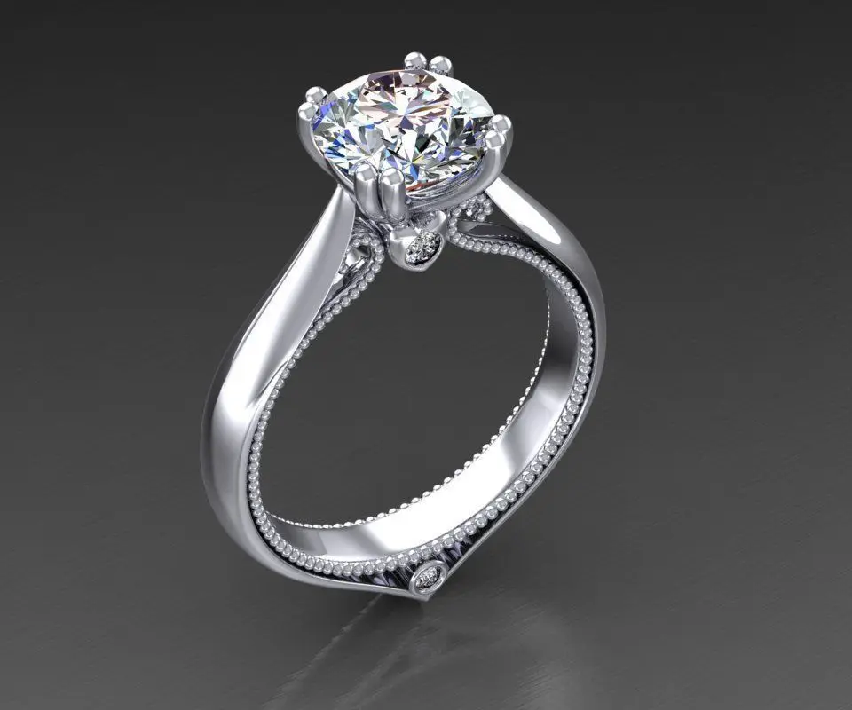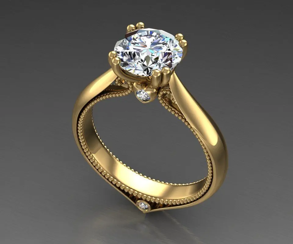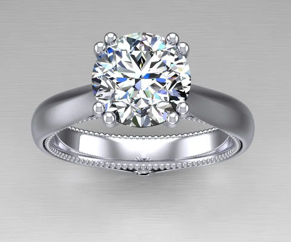 Beautiful vintage style engagement ring with a round diamond in the center with surprise diamonds on the sides