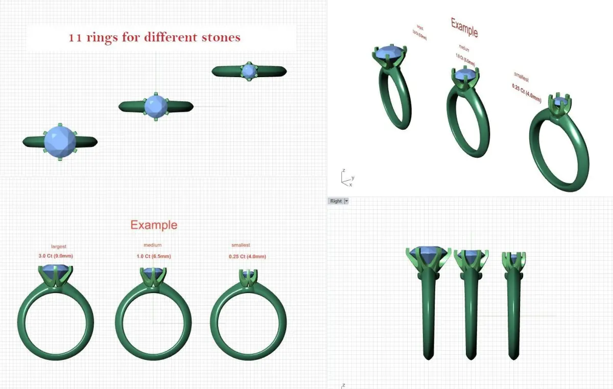 Each ring consists of two parts for the convenience of processing and combining metals,sprue feed and stone size marking are provided, as well as precise places for fastening the ring with a bezel.Models fixed with RP Magics software and ready for prototyping on CNC or 3D Printing.